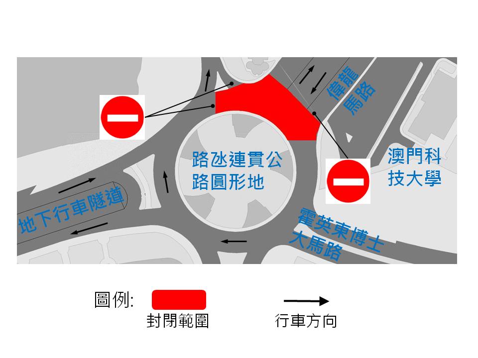 配合建設發展辦公室安裝行人天橋,本月26日至28日(周六至周一)每日零晨凌時至翌日清晨6時,路氹連貫公路圓形地近嘉樂庇總督馬路的路段及近偉龍馬路的路段會臨時封閉,同時介乎光復街至路氹連貫公路圓形地之間的一段嘉樂庇總督馬路(往路氹城方向)亦會改為無出口道路,並禁止車長超過5米的車輛駛入。交通事務局呼籲駕駛者留意。