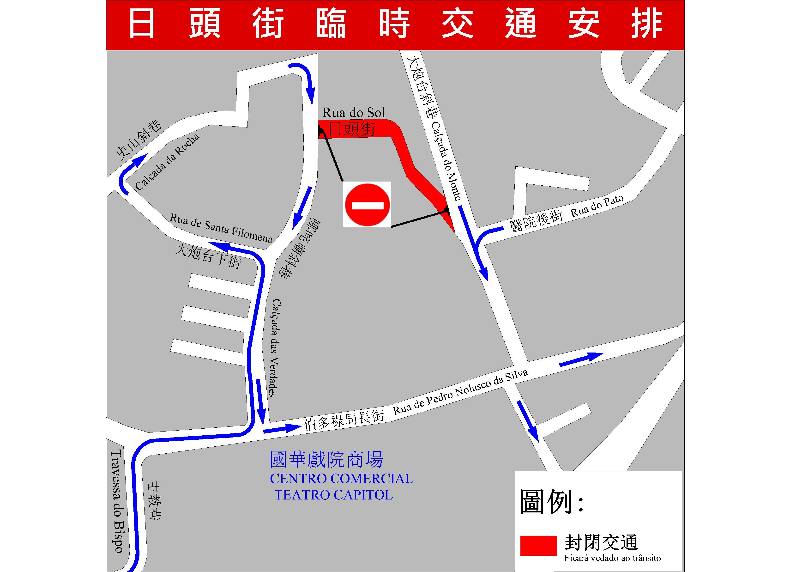 配合電力公司和電信公司鋪設管道,位於大炮台斜巷與哪咤廟斜巷之間的日頭街於本月28日(周六)早上10時起臨時封閉及禁止泊車,為期約15日,期間,車輛如要前往哪咤廟斜巷及大炮台下街,必須經南灣大馬路、大堂斜巷及板樟堂街前往。