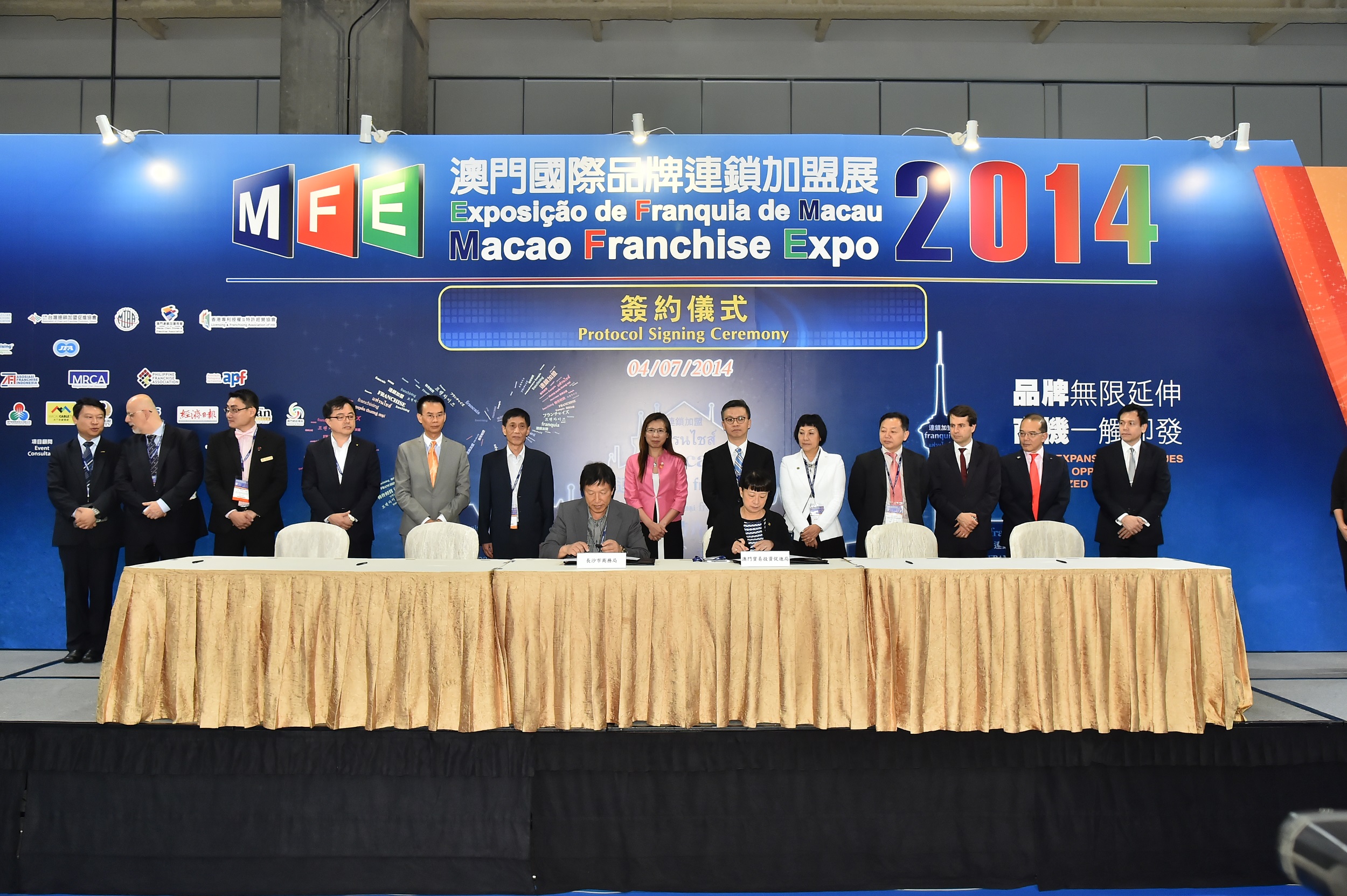 今屆MFE繼續發揮區域連鎖加盟作用,今日共有六個簽約項目,簽署機構包括澳門貿易投資促進局與長沙市商務局、澳門悅健健康食品有限公司與韓國豐基人參公社、澳門味蕾時尚烘焙與加盟商張鍾明、澳門補之林飲食(集團)有限公司與加盟商陳宗保、澳門韓美有限公司與IT'S SKIN CO. LTD.、香港潮酒城堡有限公司與金源澳門離岸商業服務有限公司。
