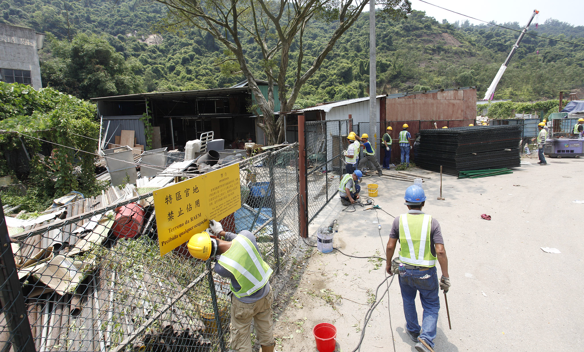 繼上周後,特區政府今日(7月8日)再採取跨部門行動,前往鄰近九澳高頂馬路、位於石礦場東南側被重新霸佔的特區土地,修復被非法破壞的圍網,防止有關土地再被非法霸佔。對於有人公然挑戰法紀,重霸已收回特區土地,並在內放置貨櫃、建築機械、建築材料等雜物及建有棚屋,且佔用地段內公共道路的部分路段,政府予以讉責,重申闖入及重霸已收回特區土地的行為屬刑事罪行,可被處以徒刑,政府為此已於年前向司法機關提出檢舉。