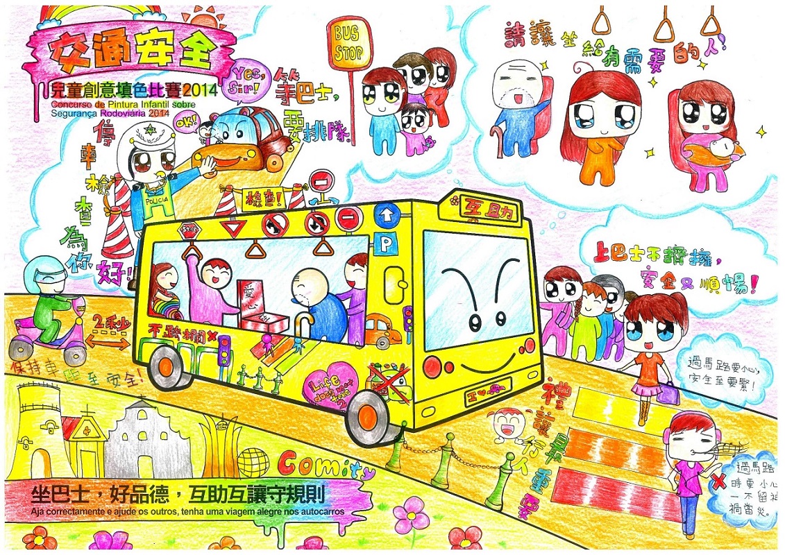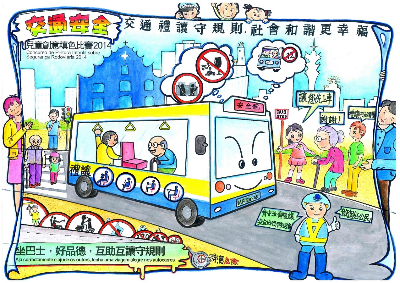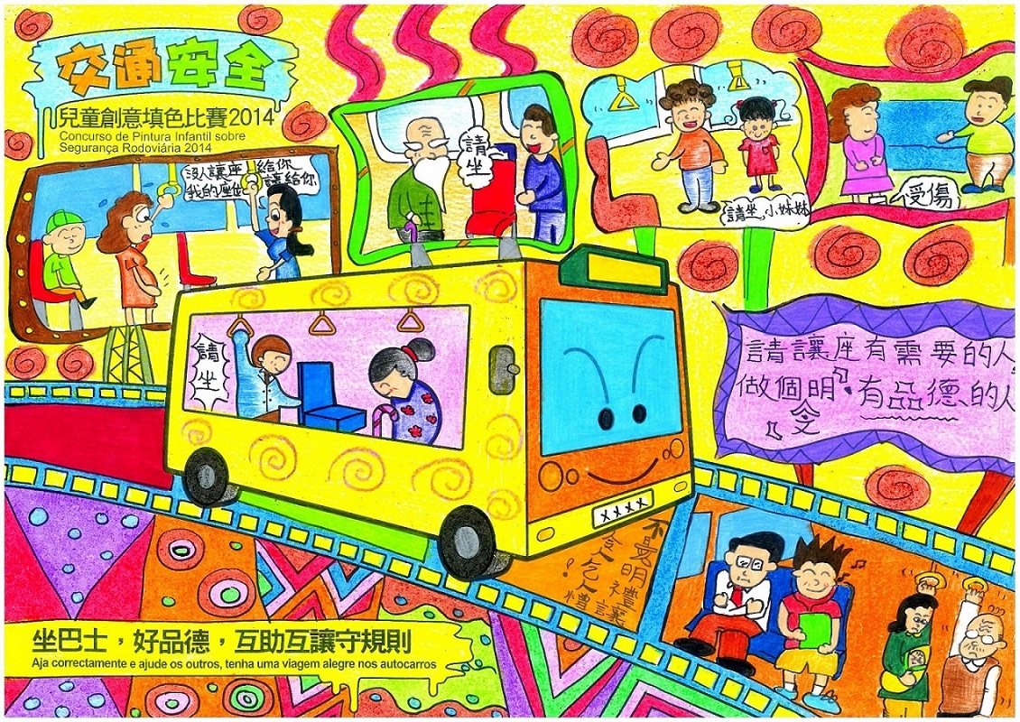 現時本澳每日平均有近五十萬人次使用巴士出行,隨著使用人次不斷增加,有禮互助的乘車精神亦顯得十分重要。為鼓勵兒童從小培養良好的乘車品德,交通事務局、治安警察局、法務局及民政總署今年繼續合辦“交通安全兒童創意填色比賽",並以“坐巴士,好品德,互助互讓守規則”為題,希望透過填色及主題創作,讓兒童在畫稿上發揮創意空間,展現不同的乘客好品德。