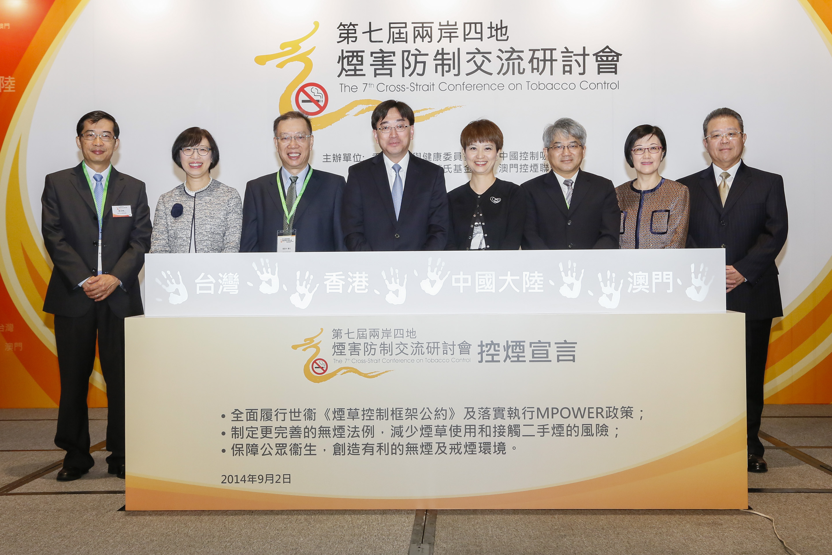 由香港吸煙與健康委員會主辦的“第七屆兩岸四地煙害防制交流研討會”於2014年9月2日至3日在香港舉行,澳門代表團一行24人出席研討會。是次研討會的主題為“實踐MOPOWER,履行《煙草控制框架公約》”,香港食物及衛生局局長高永文醫生、澳門衛生局局長李展潤醫生、香港食物及衛生局副局長陳肇始教授、香港衛生署署長陳漢儀醫生、香港吸煙與健康委員會主席劉文文女士、中國控制吸煙協會會長黄潔夫醫生、台灣財團法人董氏基金會執行長姚思遠教授以及衛生局副局長鄭成業醫生共同主持開幕儀式。