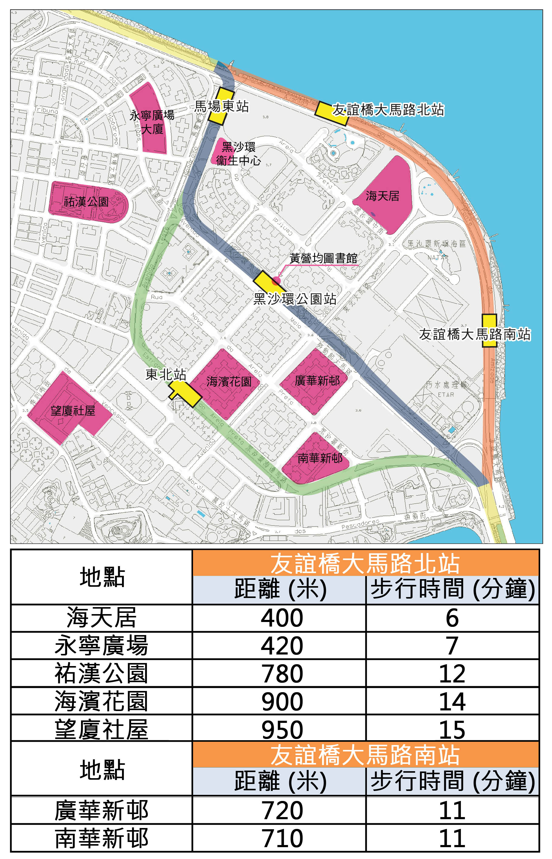 友誼橋大馬路為北區接駁友誼大橋的主要通道,在東北區的交通疏導上扮演着重要的角色。雖然輕軌的高架橋墩置於黑沙環海濱公園之中,但由於海濱公園面積狹長,最窄的位置只有約8米,不足以完全涵蓋施工範圍,且並沒有足夠條件採取分段施工的方式,因此,施工期間除需要佔用整個海濱公園外,亦需要佔用友誼橋大馬路1至2條行車道;車站位置則需佔用更多路面空間。預料工程對友誼橋大馬路的交通將帶來嚴重影響,並增加區內周邊道路的分流壓力。