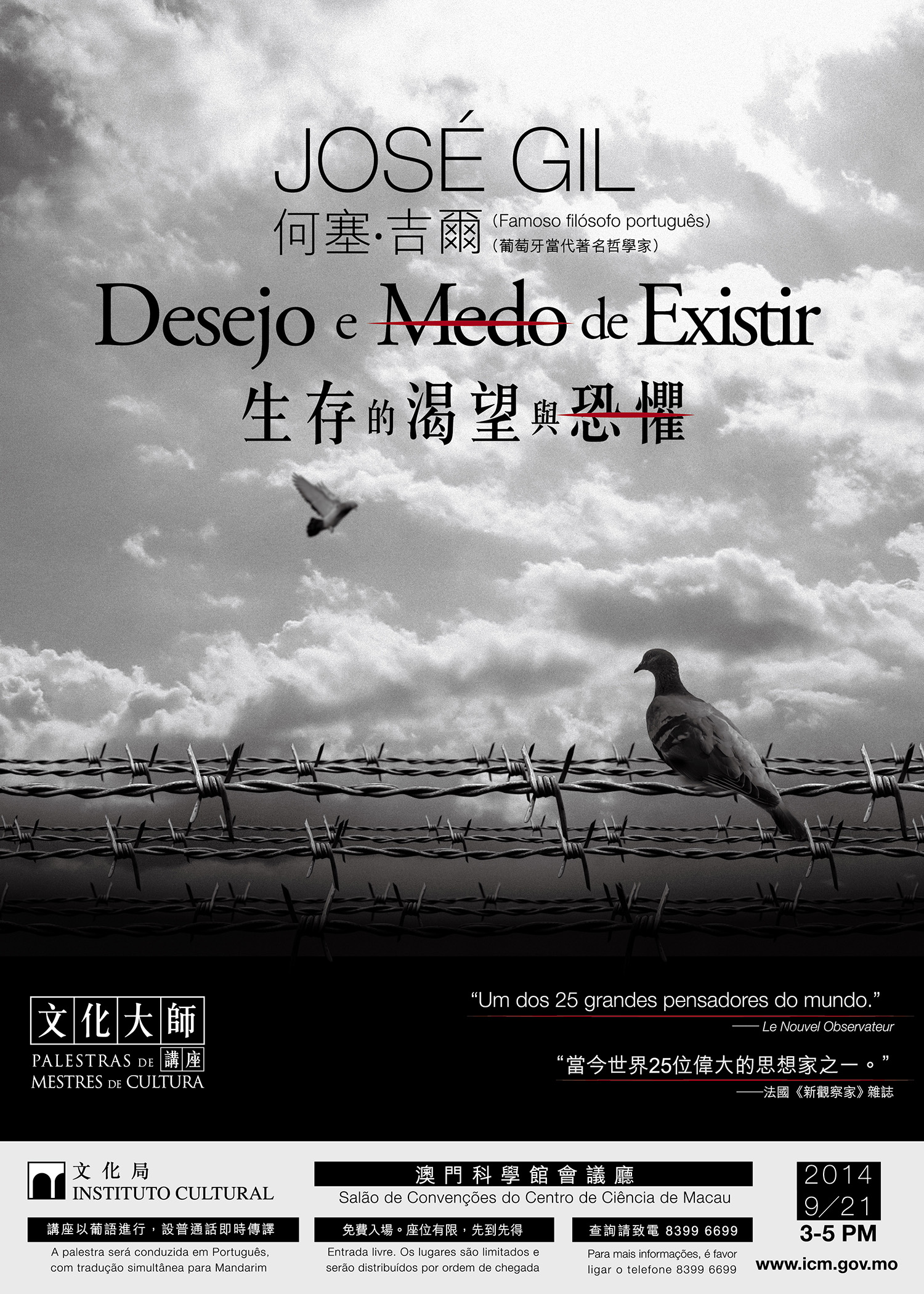 為豐富市民文化生活,拓闊文化視野,文化局特別策劃“文化大師講座”。本年度的“文化大師講座”將於本周日(九月二十一日)下午三時假澳門科學館會議廳舉行,由葡萄牙著名哲學家何塞‧吉爾主講“生存的渴望與恐懼”,活動以葡語進行,現場設普通話即時傳譯,歡迎市民出席。