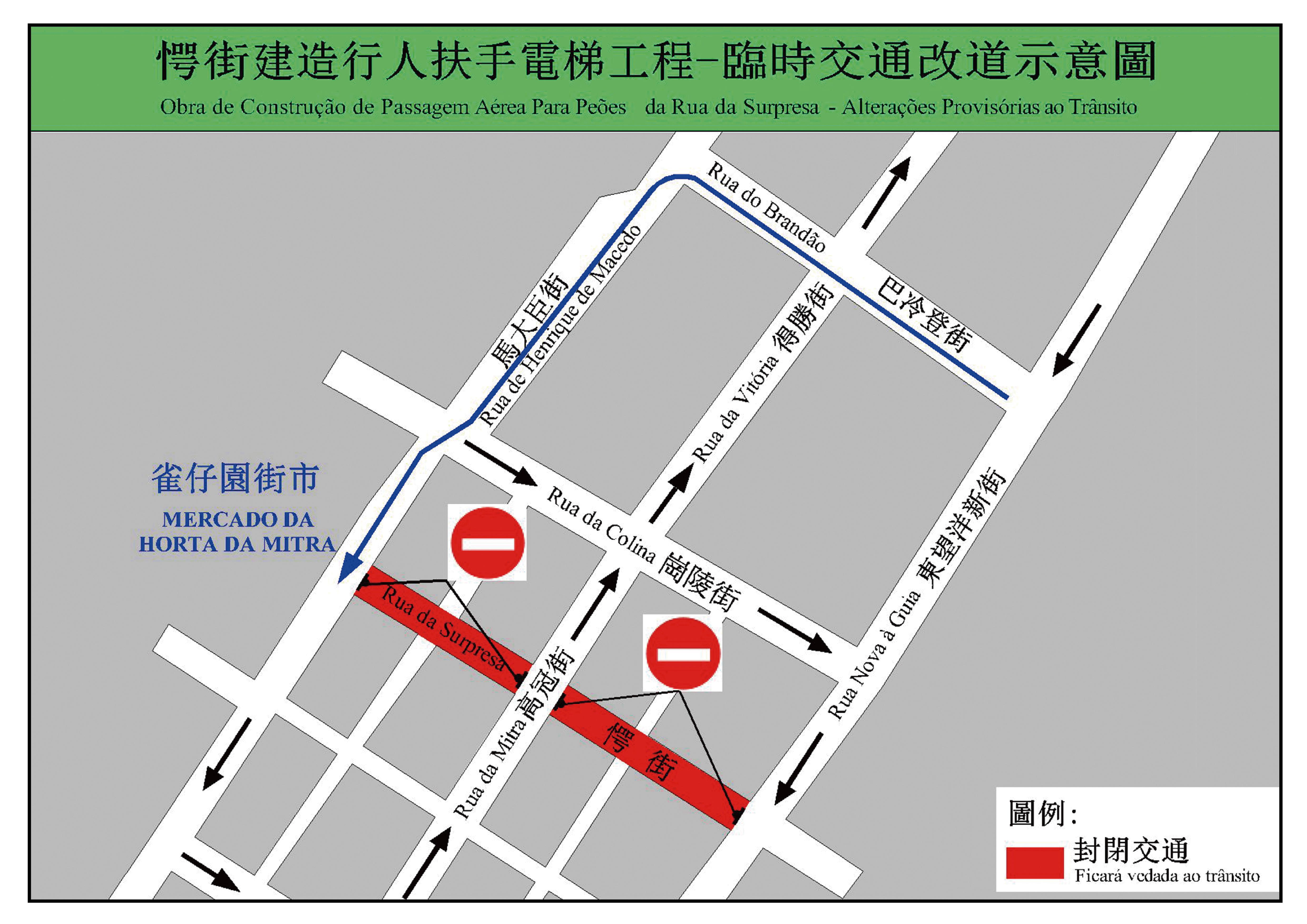 配合特區政府致力創造便捷步行環境的規劃,並因應愕斜巷升降機啟用後帶動人流增加,經聽取居民及商戶意見後,政府將於較為陡斜難行的愕街設置自動扶梯系統,方便居民出行。有關工程今天(9月19日)早上10時起動工,工期約450日。為減低對周邊居民的影響,工地兩旁設置圍板分隔工地與行人,並要求施工單位做好工地的防污措施;配合工程展開,愕街將改為禁止車輛通行,車輛可經由巴冷登街前往馬大臣街。