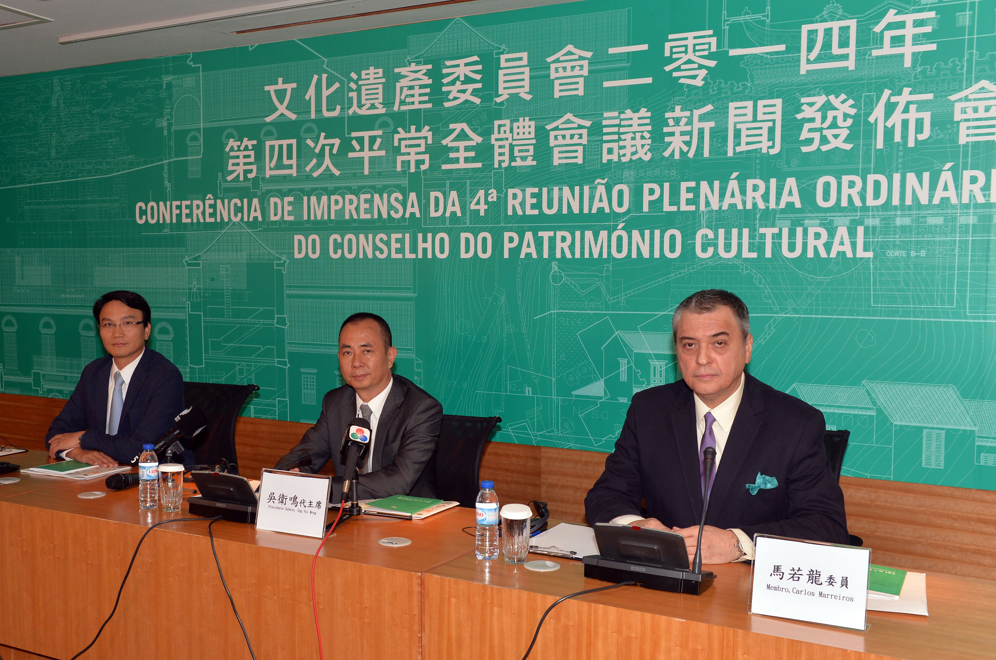 文化遺產委員會(十月十五日)下午三時在文化局大樓舉行“二零一四年第四次平常全體會議”新聞發佈會。委員會代主席吳衛鳴、秘書長張鵲橋,以及委員會對外發放訊息之代表馬若龍委員與傳媒見面,介紹委員會第四次平常全體會議情況。