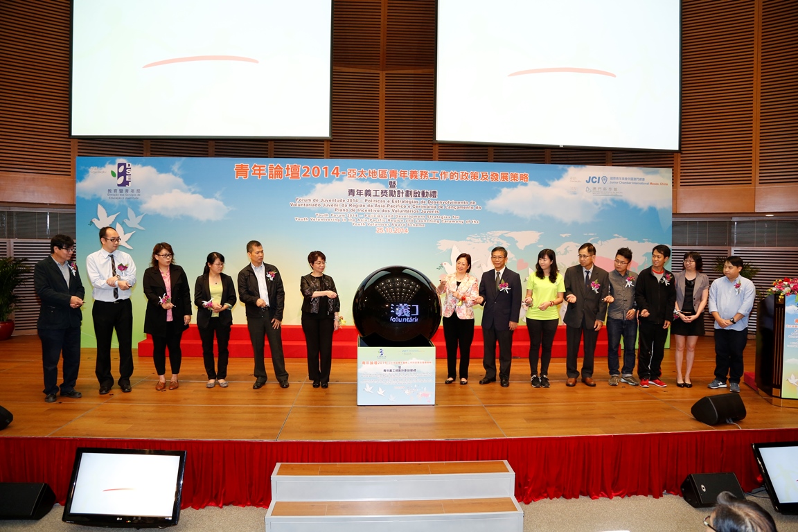 “青年論壇2014──亞太地區青年義務工作的政策及發展策略”暨“青年義工獎勵計劃”啟動禮由社會文化司司長司長辦公室張素梅主任、中央人民政府駐澳門特別行政區聯絡辦公室文化教育部李正橋部長級助理、教育暨青年局梁勵局長、澳門科學館邵漢彬館長、教育暨青年局老柏生副局長、中國台灣中華領袖菁英交流協會張仕賢會長、中國珠海市青年聯合會李娟副主席、中國宜賓市青年聯合會彭亮副主席、香港義務工作發展局羅汝衡委員、國際青年商會中國澳門總會盧善滔會長主持開幕儀式及啟動禮,逾300人出席論壇。