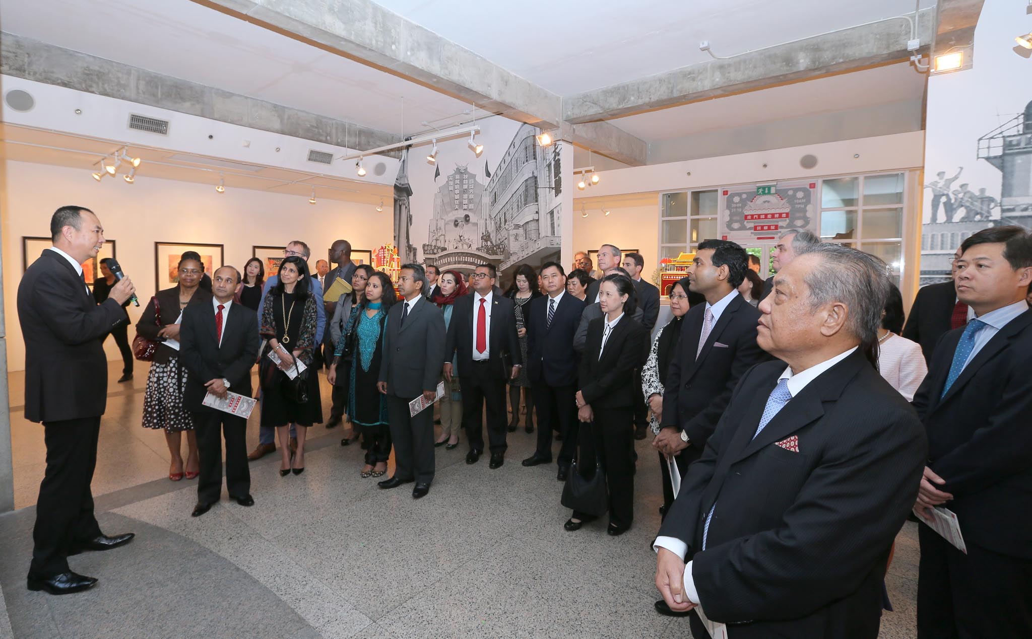 在文化局局長吳衛鳴、副局長梁曉鳴及文化活動廳廳長楊子健等陪同,以及澳門美術協會會長黎鷹的導賞下,領事團參觀了由文化局、澳門基金會及澳門美術協會聯合主辦的《慶祝澳門回歸祖國十五周年-澳門國慶牌樓回顧展》展覽,認識及了解澳門慶祝國慶期間極具特色的牌樓文化。是次展覽展出以澳門國慶牌樓為主題的作品,包括由昔日曾參與國慶牌樓設計的成員及澳門美術協會會員所創作的三十幅專題繪畫作品,同時展出珍貴的澳門國慶牌樓照片及模型。領事們對於搭建牌樓感興趣,並對製作團隊日以繼夜合力搭建牌樓的歷程表示欣賞。