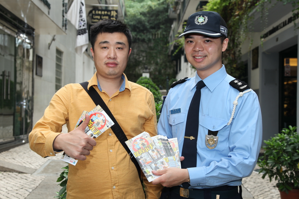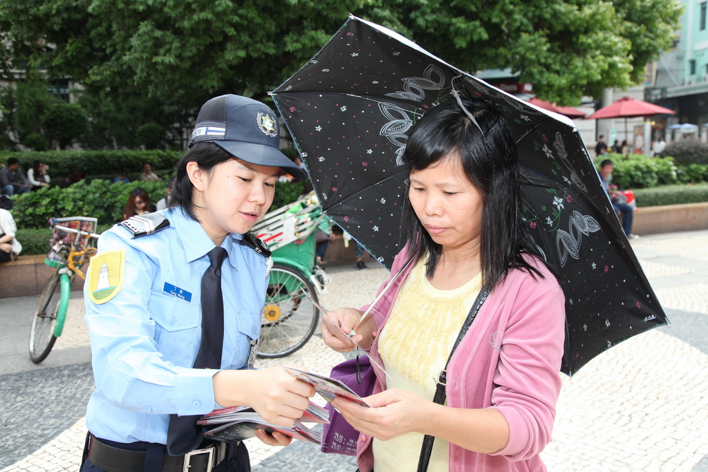 於今天早上十一時,本局公共關係處劉國熙副警司連同第一警務警司處人員一行六人,分別在新馬路及議事亭前地一帶進行防扒宣傳活動。期間,向居民及旅客講解常見的扒竊手法和派發多款防罪小冊子,並即場對財物外露的人士作出溫馨提示。