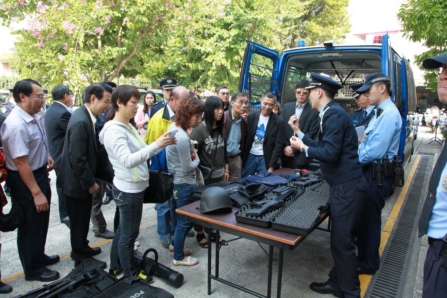 活動接著由警務廳及交通廳的代表就本年的整體治安形勢進行工作簡報,透過統計數字介紹治安以及交通狀況,提醒社區主任第四季度應防範的事項,亦播放了內部士氣宣傳片予嘉賓欣賞;其後社區主任參觀了交通廳的裝備器材,以及今年最新推出的特別巡邏組車輛及精良裝備。交通管理工作與市民生活息息相關,而今年新成立的特別巡邏組更是市民安全所賴,當中展示的各種新式防護裝備和武器吸引了嘉賓的視線,社區主任們展現出極大的興趣,讚嘆之餘紛紛發問,拍照留念或親身試用警備,互動氣氛熱烈。