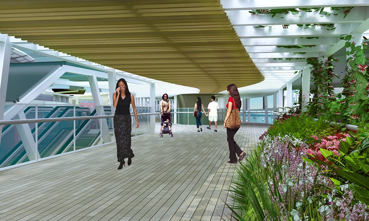 基馬拉斯大馬路空中綠廊設有上蓋,各上落點均設有樓梯和升降機或扶手梯,橋面設置電動行人輸送帶,為居民提供人車分隔及無障礙的過路環境。此外,空中綠廊也是氹仔市中心最大綠化休憩空間──氹仔中央公園的延伸,會有水平和垂直綠化面積,綠化及其他休閒設施在整個項目中交錯而成一綠色休閒環境。未來,空中綠廊更可通過運動場輕軌站,延伸至東亞運大馬路海濱單車徑及路氹城區,並預留空間連接至湖畔大廈的氹仔北新規劃區,構建氹仔舒適、便利的步行環境,打造為綠色出行示範區。