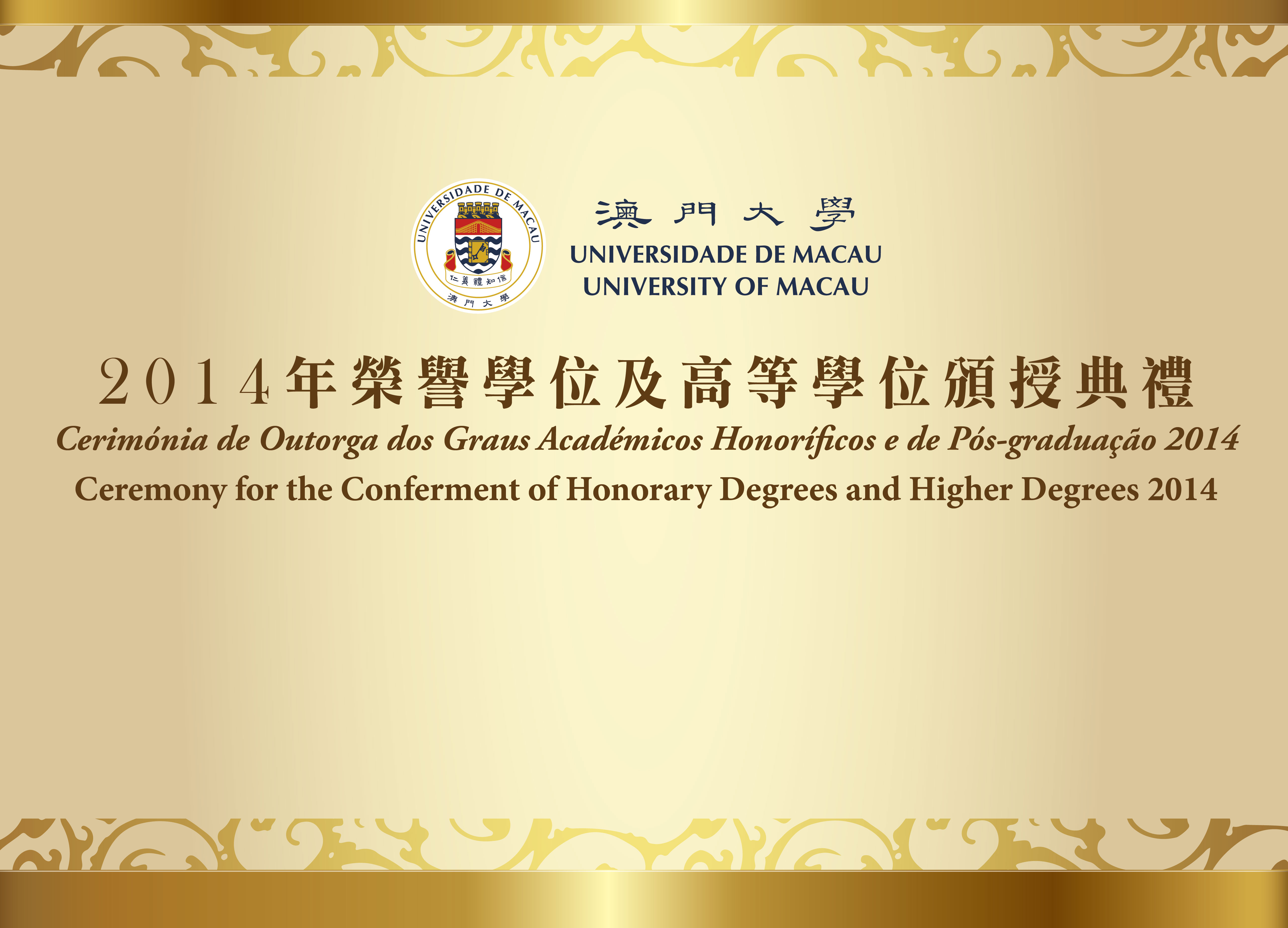 澳門大學將於十二月六日舉行二○一四年榮譽學位及高等學位頒授典禮,向擁有卓越成就,以及為社會發展和教育做出重大貢獻的傑出人士頒授榮譽博士學位。此外,同場亦會頒授博士及碩士學位。