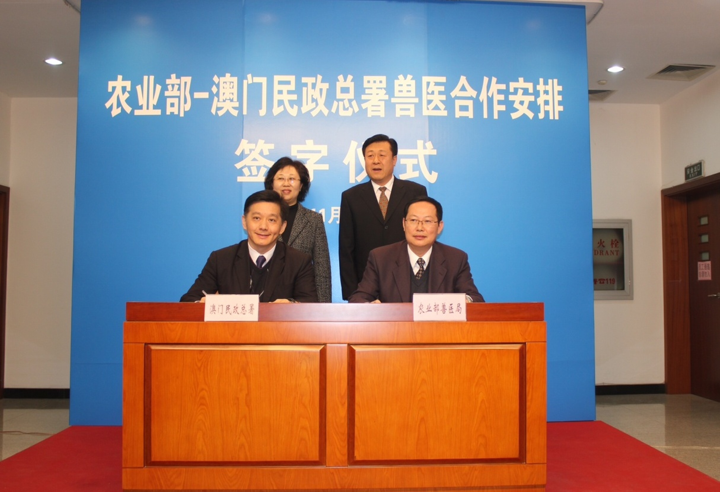 在陳麗敏及國家農業部副部長于康震見證下,民政總署管理委員會主席黃有力與國家農業部獸醫局局長張仲秋共同簽署了《中華人民共和國農業部與澳門特別行政區民政總署關於獸醫合作的安排》,內容包括重點加強雙方在獸醫立法、執業獸醫管理、動物疫情和初級動物源性食品安全重大事件通報、國際獸醫事務、人員培訓等方面的交流合作,在世界動物衛生組織(OIE)相關活動中的合作、建立獸醫管理機構直接對話機制、將禽流感等重大動物疫病和狂犬病等重點人畜共患病列為雙方聯防聯控重點動物疫病、就內地獸醫在澳門執業及推進澳門居民在內地參加執業獸醫資格考試和執業事宜建立直接溝通及協商機制。