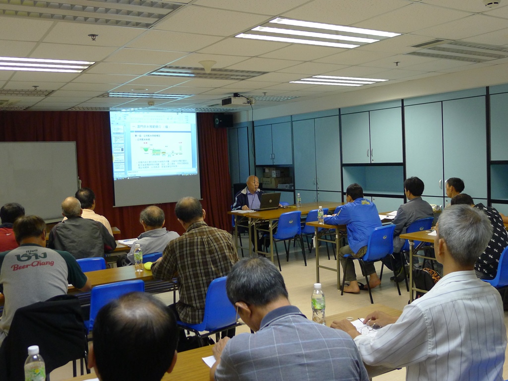 “澳門水務工程從業員實務工作坊”邀請了在供水工程事務方面具有豐富經驗的專家擔任導師,從理論角度向學員介紹《澳門供排水規章》內與供水相關章節之內容,從而帶出公共配水系統的概念、樓宇的供水方式以及工程人員的安全及衛生等注意事項。導師亦講解了樓宇內部供水設備,包括水池、水泵、喉管、水錶、砂隔以及常用的閥門等設備的結構、操作原理及作用。