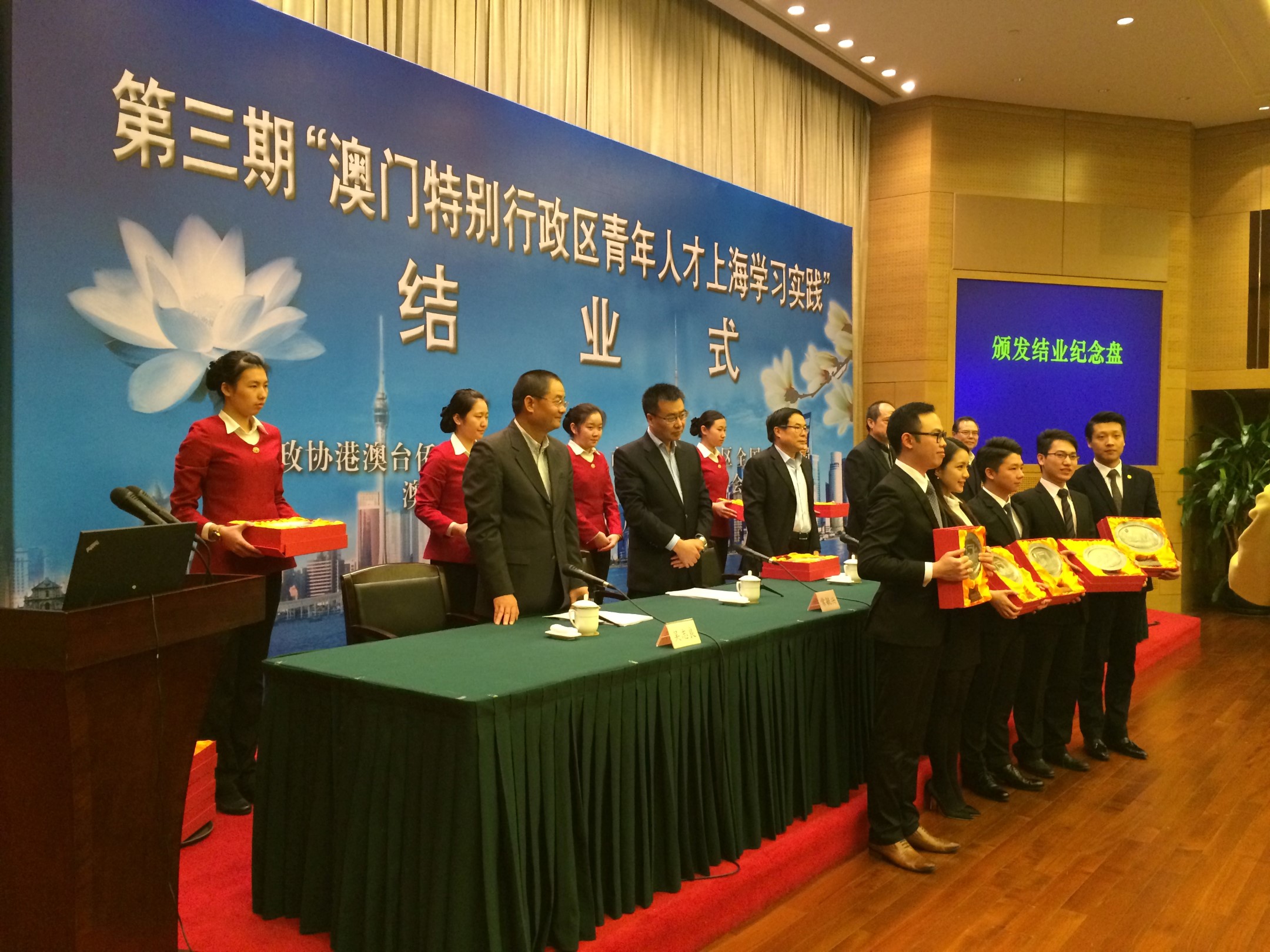 2014“澳門青年人才上海學習實踐計劃” 12月4日舉行結業式,全國政協港澳台僑委員會主任楊崇匯、副主任馬建,上海市政協副主席姜樑,中聯辦人事部部長常毓興、副部長彭清洲,協調部副部長廖笠,澳門基金會行政委員會主席吳志良等出席了儀式。主辦單位寄語學員需常持回饋社會的信念,學以致用,以點帶面,形成社會正能量,推動特區發展。