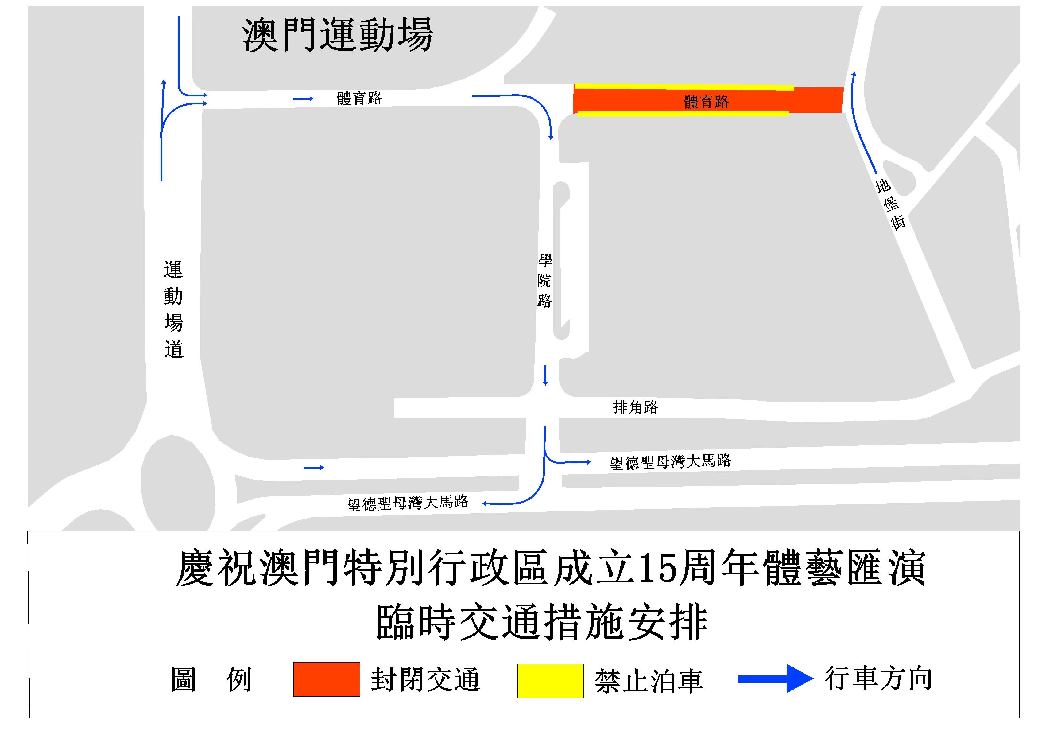 配合體育發展局舉辦體藝匯演活動,介乎地堡街與學院路之間的一段體育路將於本月20日(周六)上午11時至下午6時封閉,體育路並於本月12日(周五)至16日(周二)、20日至21日(周日)每日上午9時半至中午12時半及下午2時至5時半實施有限度通車,相關路段的部分泊車位亦於本月17日(周三)至20日(周六)臨時封閉,直至活動結束。