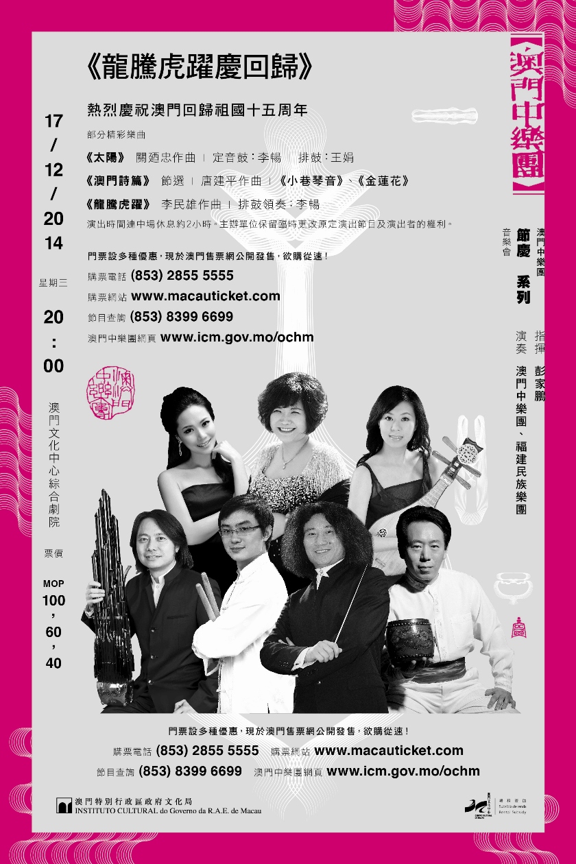 為歡慶澳門回歸祖國十五周年,文化局澳門中樂團將於十二月十七日(星期三)晚上八時假文化中心綜合劇院舉行《龍騰虎躍慶回歸》音樂會,門票現已發售,歡迎巿民購票欣賞。