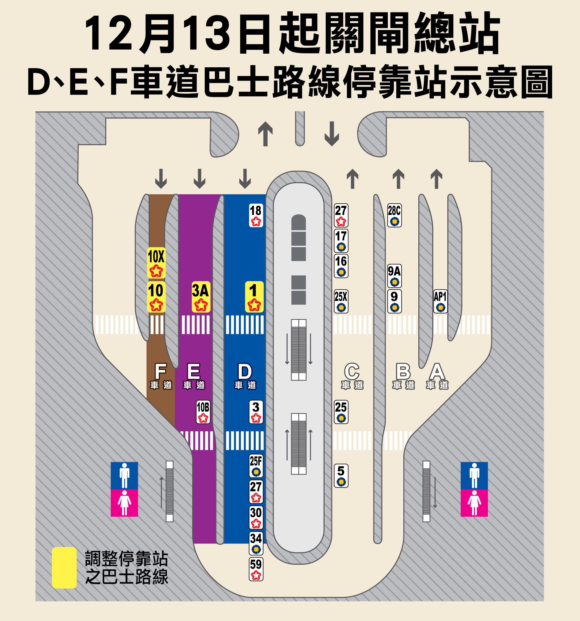 為優化關閘總站的候車條件,並讓乘客及早熟悉有關安排,交通事務局周六(13日)起,調整總站內1、3A、10及10X路線的停靠位置,具體安排是:1路線調整至停靠候車室旁的D車道(M1/5)、3A路線調整至停靠其次的E車道(M1/2)、10及10X路線則調整至停靠距候車室最遠的F車道(M1/1),其他不變,透過安排行程相近的巴士路線在同一車道停靠,有助方便乘客候車。調整初期,局方將在現場增加指示及安排人員駐站指引乘客候車。