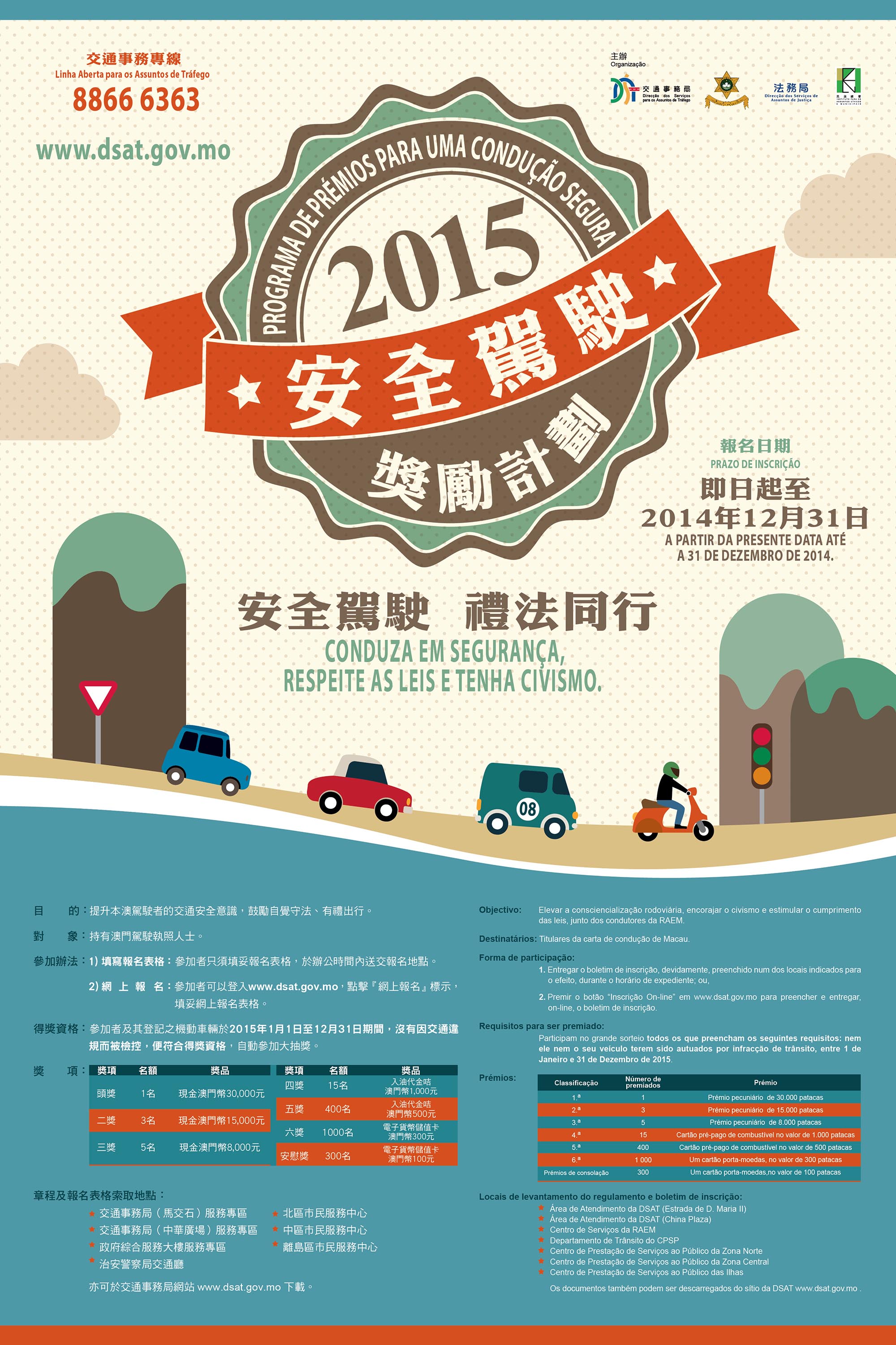 參加者及其登記之機動車輛只須於2015年1月1日至12月31日期間,沒有因交通違規而被檢控,便符合資格參加大抽獎。得獎名額共1,724個,頭獎1名可獲現金30,000元,二獎3名可獲現金15,000元,三獎5名可獲現金8,000元,四獎15名可獲入油代金咭1,000元,五獎400名可獲入油代金咭500元,六獎1,000名可獲面值澳門幣300元的電子貨幣儲值卡乙張,以及安慰奬300名可獲面值澳門幣100元的電子貨幣儲值卡乙張。每名參加者可獲贈小禮品乙份,網上報名人士可於完成手續翌個工作天,前往交通事務局服務專區向工作人員報上姓名及駕駛執照編號即可領取小禮品,數量有限,送完即止。