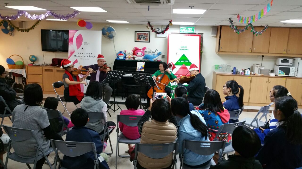 澳門樂團藉聖誕佳節探訪弱勢社團,於十二月十六及十七日到訪了基督教中國佈道會恩慈院兒童之家及少年感化院,舉行了三場以聖誕音樂為主題的音樂會,向現場超過五十位觀眾送上關懷及問候。除了傳播悠揚的音樂外,澳樂更派發向澳門扶康會購買、由扶康會院生親自製作及包裝的聖誕禮品包,實行以愛心送愛心的理念。