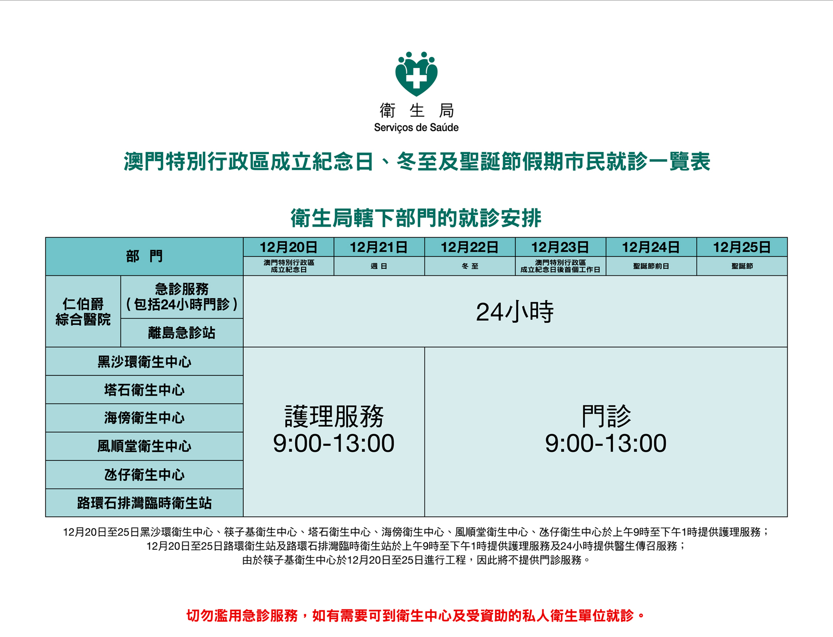 澳門特別行政區成立紀念日(12月20日)、冬至(12月22日)、聖誕節前日(12月24日)及聖誕節(12月25日)為公眾假日,而澳門特別行政區成立後首個工作日(12月23日)為公共行政工作人員獲准豁免上班日,上述期間衛生局將維持相關的部分醫療服務,為此作出如下的安排: