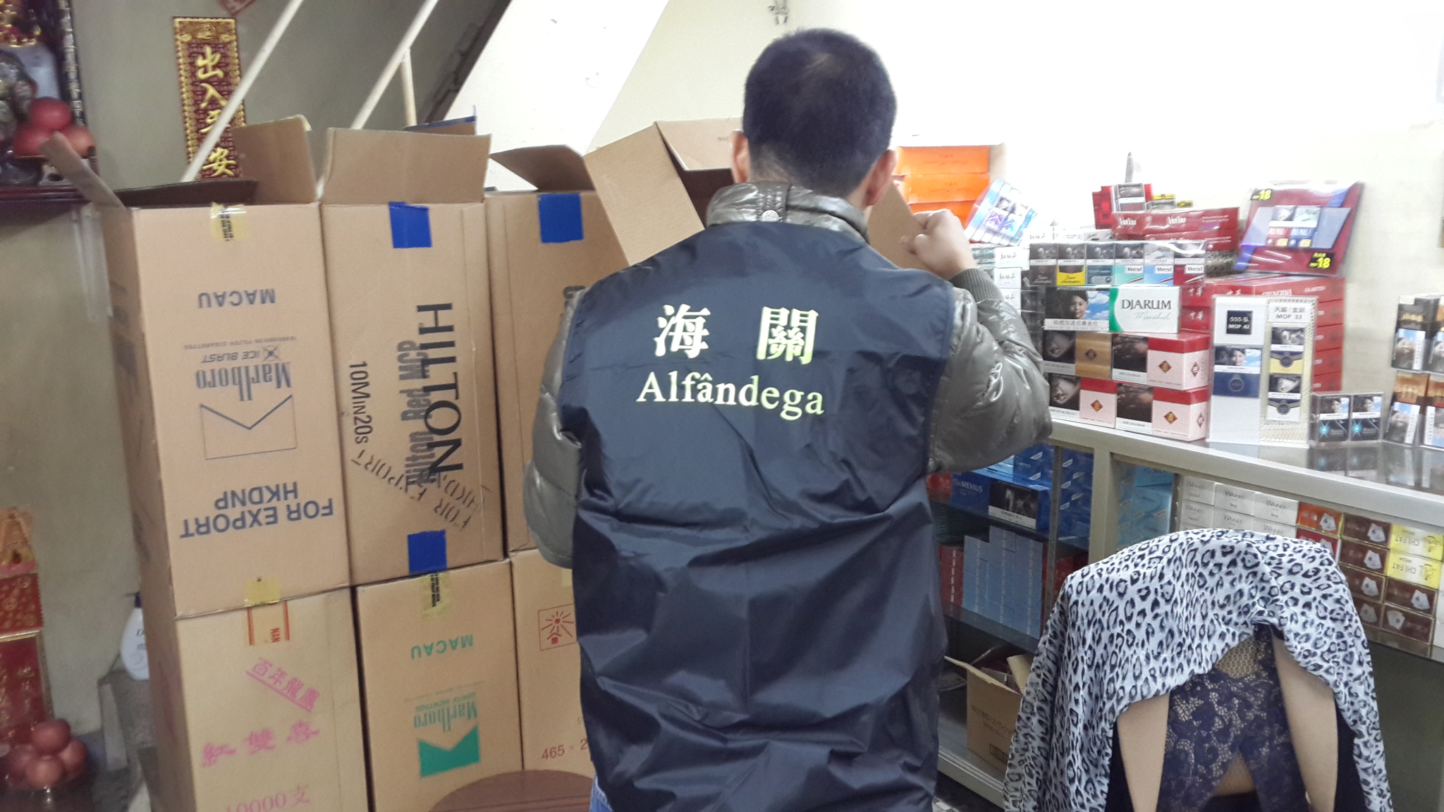 於十二月十六日,澳門海關知識產權廳透過跨域情報交流,聯同廣東省公安廳經濟犯罪偵查局、珠海市公安局經濟犯罪偵查支隊、珠海市煙草專賣局、和澳門衛生局預防及控制吸煙辦公室執法人員,按計劃分別在珠澳兩地採取突擊巡查行動。澳門海關知識產權廳在本澳各區採取巡查行動,行動中海關在北區一間捲煙專買店,發現有人售賣懷疑假冒「中華」品牌的捲煙及未完稅的外地品牌捲煙,海關遂帶走涉案店舖負責人到海關總部協助調查。該負責人姓歐陽,女性,五十三歲。經初步調查所得,該店舖涉嫌觸犯第七/二零零三號法律《對外貿易法》相關規定,海關將提起行政起訴;而涉嫌侵權假冒捲煙的部份,海關將以第九七/九九/M號法令《工業產權法律制度》第二百九十二條(將產品或物品出售、流通或隱藏)所指之犯罪,將製作檢舉筆錄,呈送檢察院處理,一經定罪,將處以最高六個月徒刑或科處三十日至九十日罰金;另外,由於該店舖所營銷的捲煙,其包裝上並未具備澳門法律規定煙草製品的標籤及包裝,亦涉嫌觸犯第五/二零一一號法律《預防及控制吸煙制度》第四章之規定,澳門衛生局預防及控制吸煙辦公室執法人員亦即時在場對該店舖作適當處理。