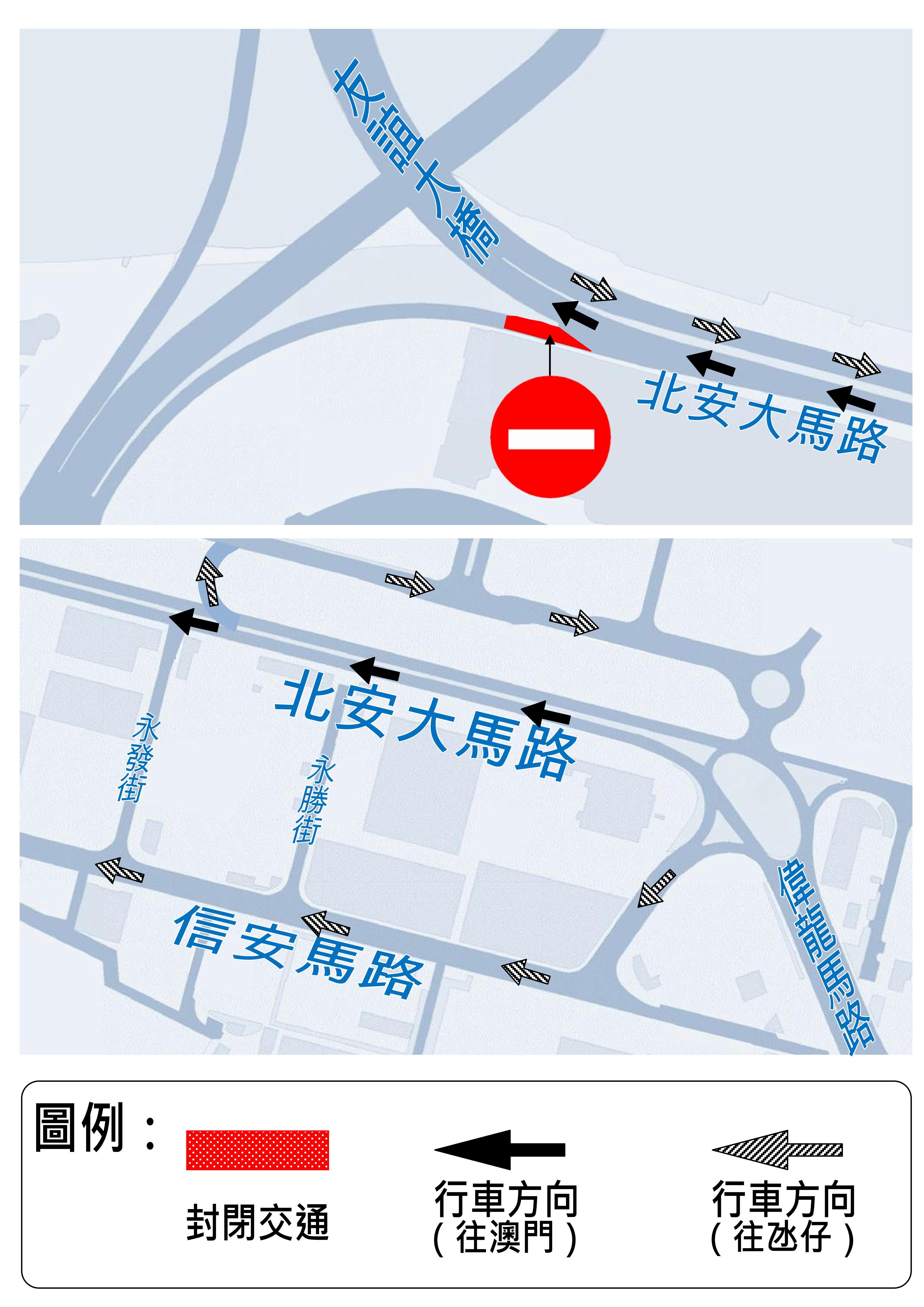 建設發展辦公室持續整治氹仔北安大馬路的道路,介乎永寧街與高勵雅馬路之間的路段,本月31日(周六)上午8時起實施封閉交通,禁止車輛駛入。期間,由偉龍馬路往氹仔市區的車輛需取道信安馬路,或經北安大馬路近永發街的迴轉路口行駛,工期約2日。交通事務局呼籲駕駛者留意。