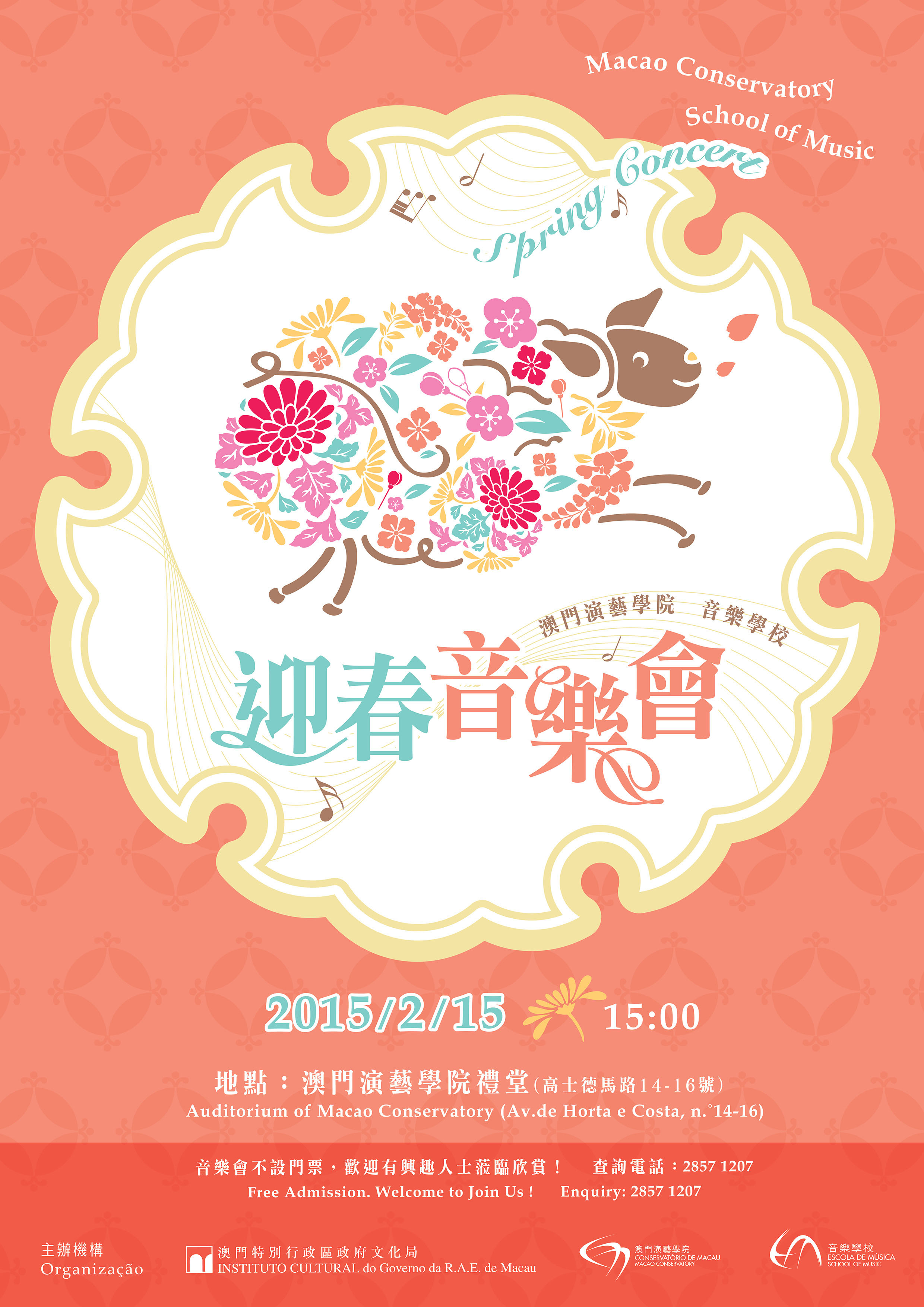 《迎春音樂會》於澳門演藝學院禮堂〈地址︰高士德馬路十四至十六號〉舉行,免費入場,座位先到先得,歡迎市民及有興趣人士蒞臨欣賞。查詢可於辦公時間內致電二八五七一二○七。