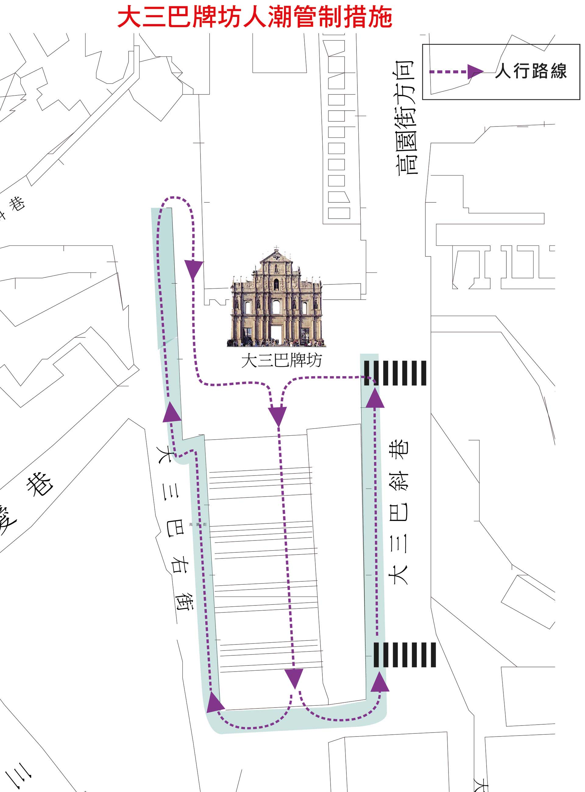 當大三巴街(手信街)人群出現擠擁時,將會實施單向人潮管制措施,人流只可單向上行往牌坊,並取道周邊的街巷如大關斜巷、關前後街、高園街等離開。