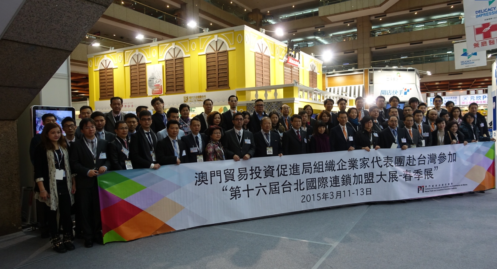 為鼓勵澳門中小企業升級轉型,協助澳門企業家尋找連鎖加盟商機,創業興業,澳門貿易投資促進局組織一行59人的澳門企業家代表團於2015年3月11至13日在台灣參加“第16屆台北國際連鎖加盟大展-春季展”(簡稱“TICFE2015”)。在台期間,貿促局利用各種場合推介澳門本土的品牌產品,幫助澳門企業以連鎖加盟模式拓展台灣以及海外市場,還安排企業家代表團成員考察了當地多家知名的連鎖及品牌企業,學習和借鑑有關的業務流程、財務管理、市場營銷等經驗。