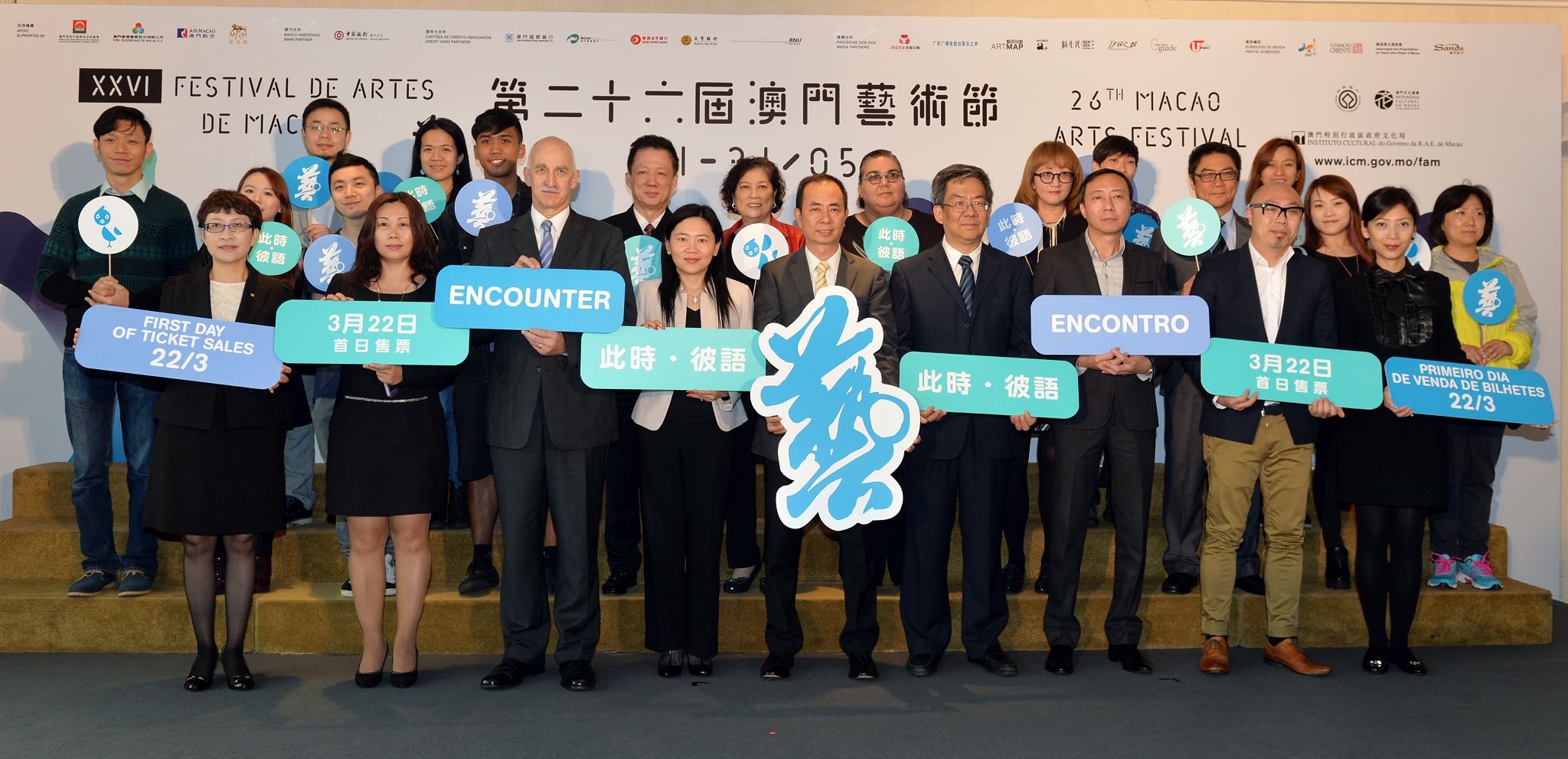 第二十六屆澳門藝術節新聞發佈會於今天(三月十六日)下午三時假澳門美高梅三樓維天閣舉行,文化局局長吳衛鳴、旅遊局副局長謝慶茜、文化局副局長梁曉鳴、美高梅中國控股有限公司首席執行官及執行董事簡博賢、澳門廣播電視股份有限公司中文電視節目部代總監陸鋼、澳門航空代表市場銷售部總經理葛嵐、文化局文化活動廳廳長楊子健、中國銀行澳門分行客戶總監余燕萍出席。