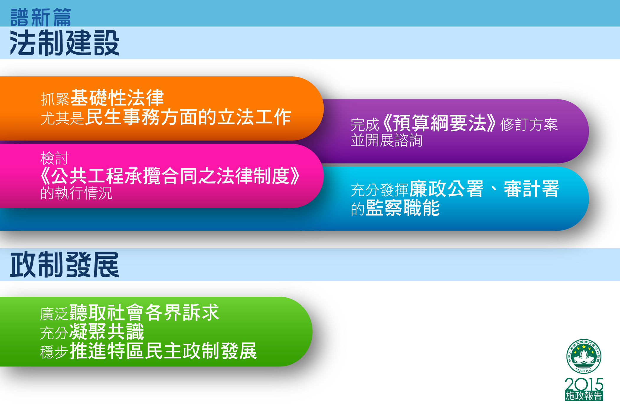 我們清醒地看到,特區法制建設尚未能完全配合和適應經濟社會的發展。政府將全力加強法制建設,抓緊完善基礎性法律,尤其是民生事務法律的立法工作。檢討《公共工程承攬合同之法律制度》的執行情況,嚴格監督公共工程的進度;根據《澳門基本法》規定的量入為出原則,遵從盈餘預算的要求,爭取今年完成《預算綱要法》修訂方案,並開展諮詢,以加強公共支出的監管。