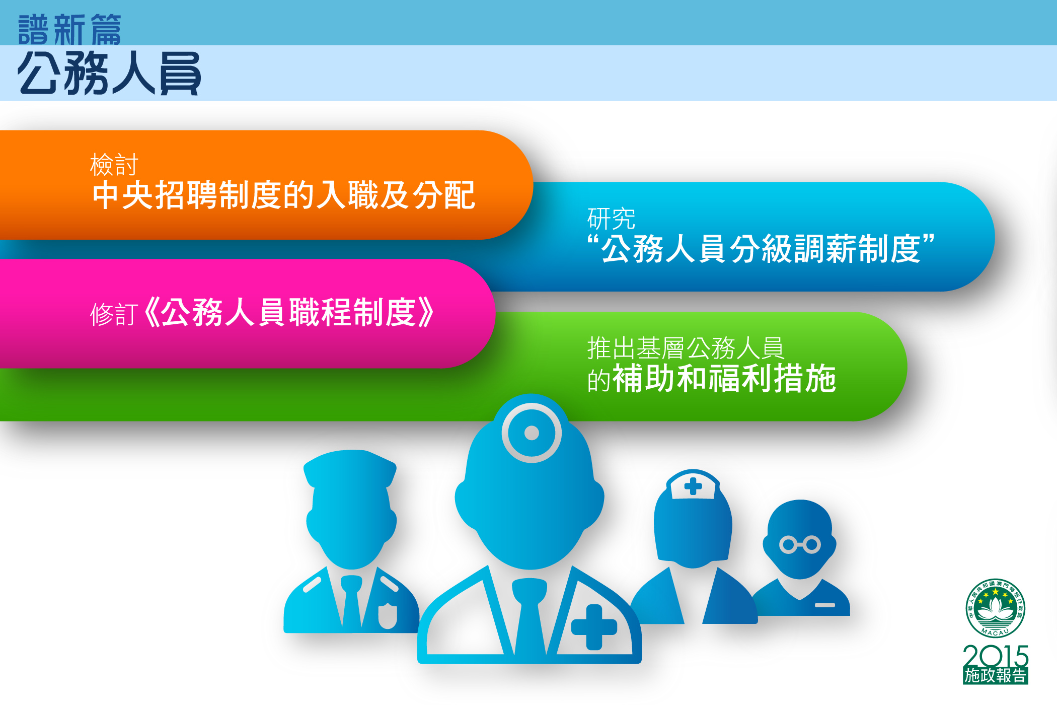 公務人員是特區政府寶貴的人力資源財富,我們十分珍惜。今年全面檢討中央招聘制度的入職及分配,研究修訂《公務人員職程制度》,重新評估各級公務人員,特別是基層公務人員的薪酬水平和購買能力,適時推出相應的補助和福利措施。同時,發揮公務人員薪酬評議會的職能,開展“公務人員分級調薪制度”的研究,充分調動公務人員的積極性。優化培訓工作的質量,提升公務人員素質,更好地為特區建設服務。