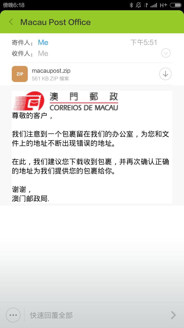 郵政局籲市民提高警覺, 留意一個顯示有郵政局標誌的電郵及要求收件人提供地址的簡體中文電子郵件(詳見附圖),該寄件人的域名與本局的域名“macaupost.gov.mo”有別, 郵政局澄清並無向客戶發出有關電子郵件。 鑑於郵件內附有一個名為 “macaupost.zip”的壓縮檔內含電腦病毒,敬告市民如收到該電子郵件, 請勿下載有關檔案。