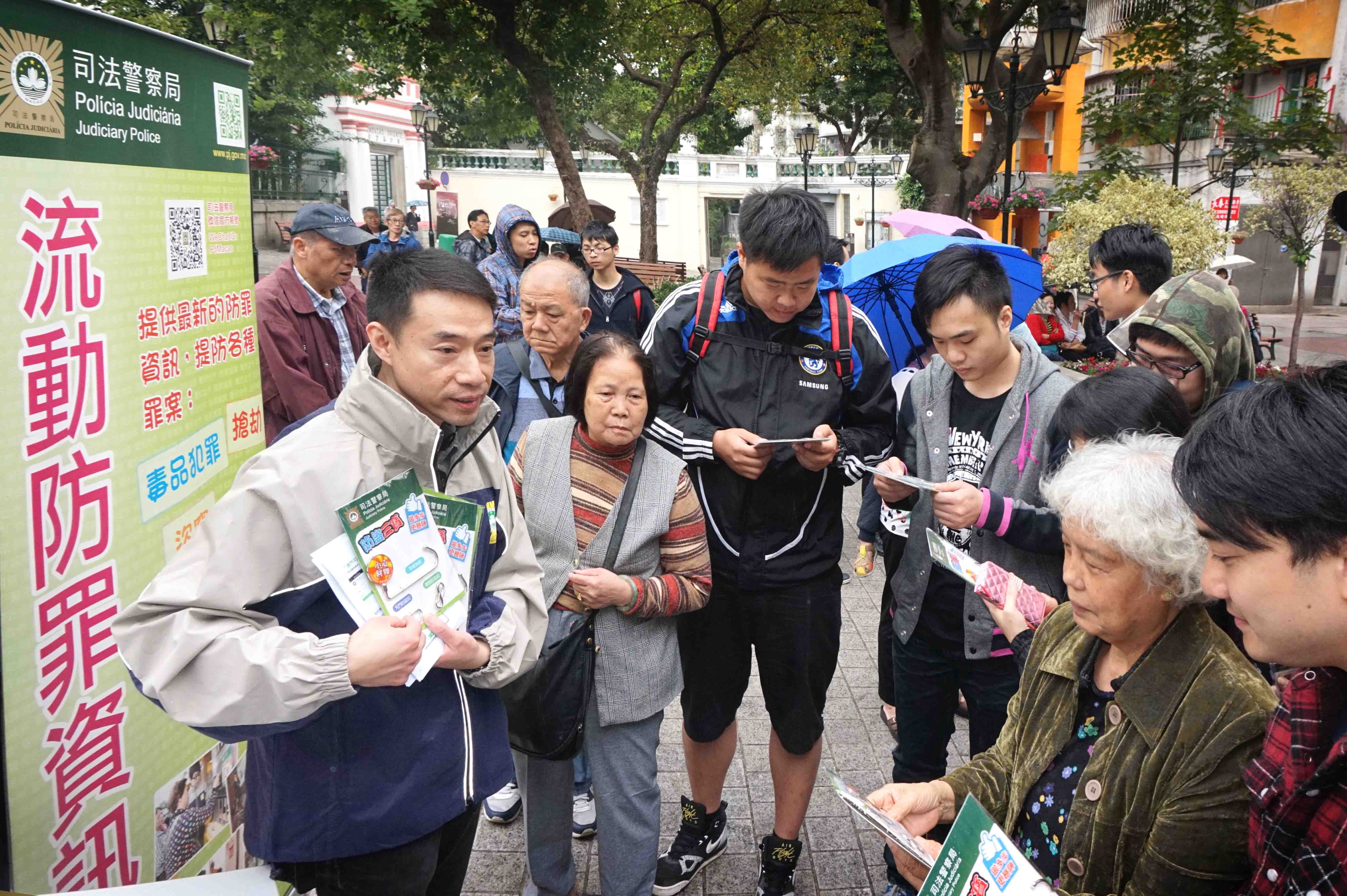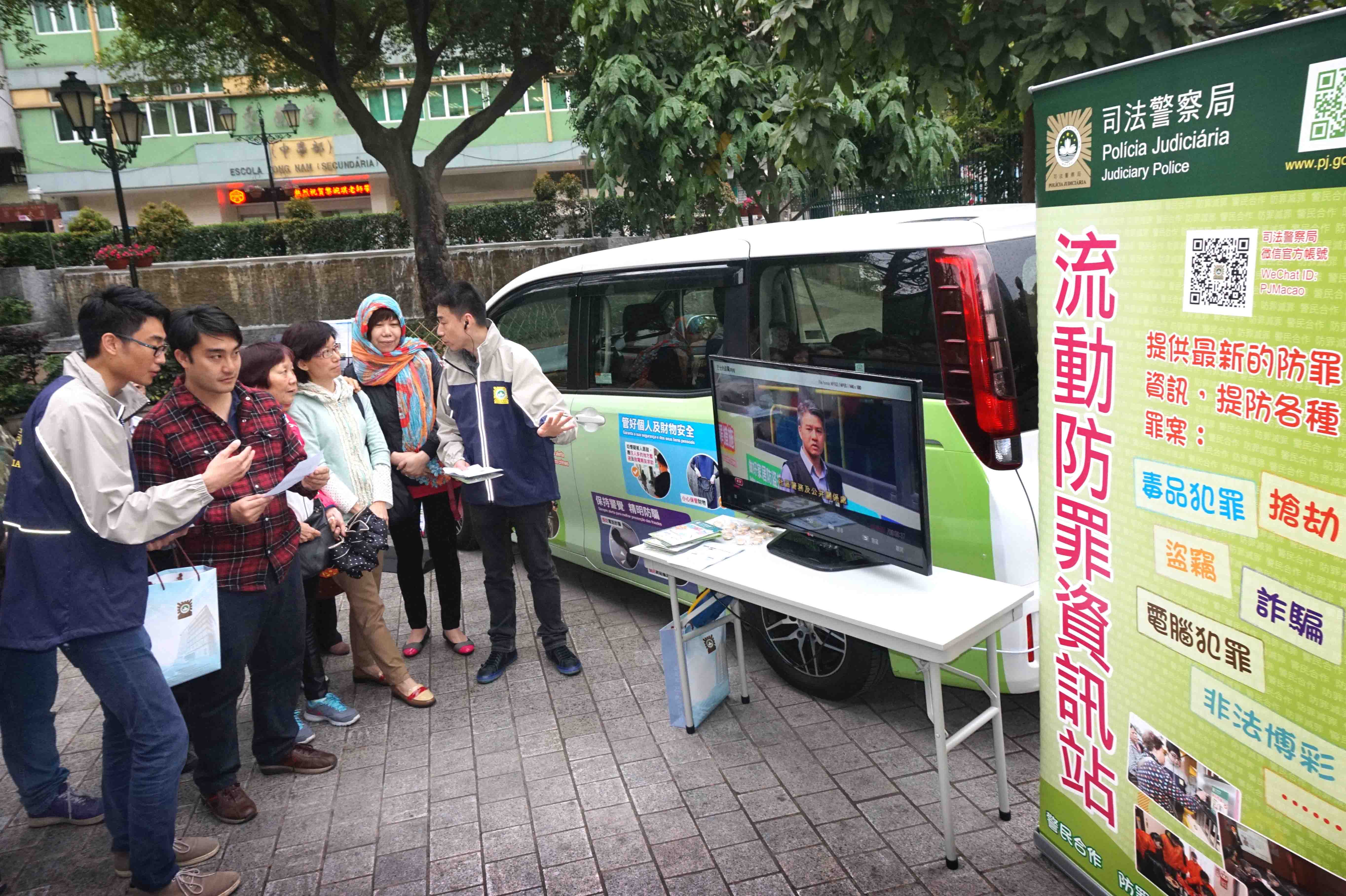 為貫徹和落實社區警務及主動警務的理念,司法警察局推出流動防罪資訊站,輪流於本澳各區公園、休憩區設點進行防罪宣傳,加強警民互動交流,吸引不少市民趨前諮詢防罪訊息。