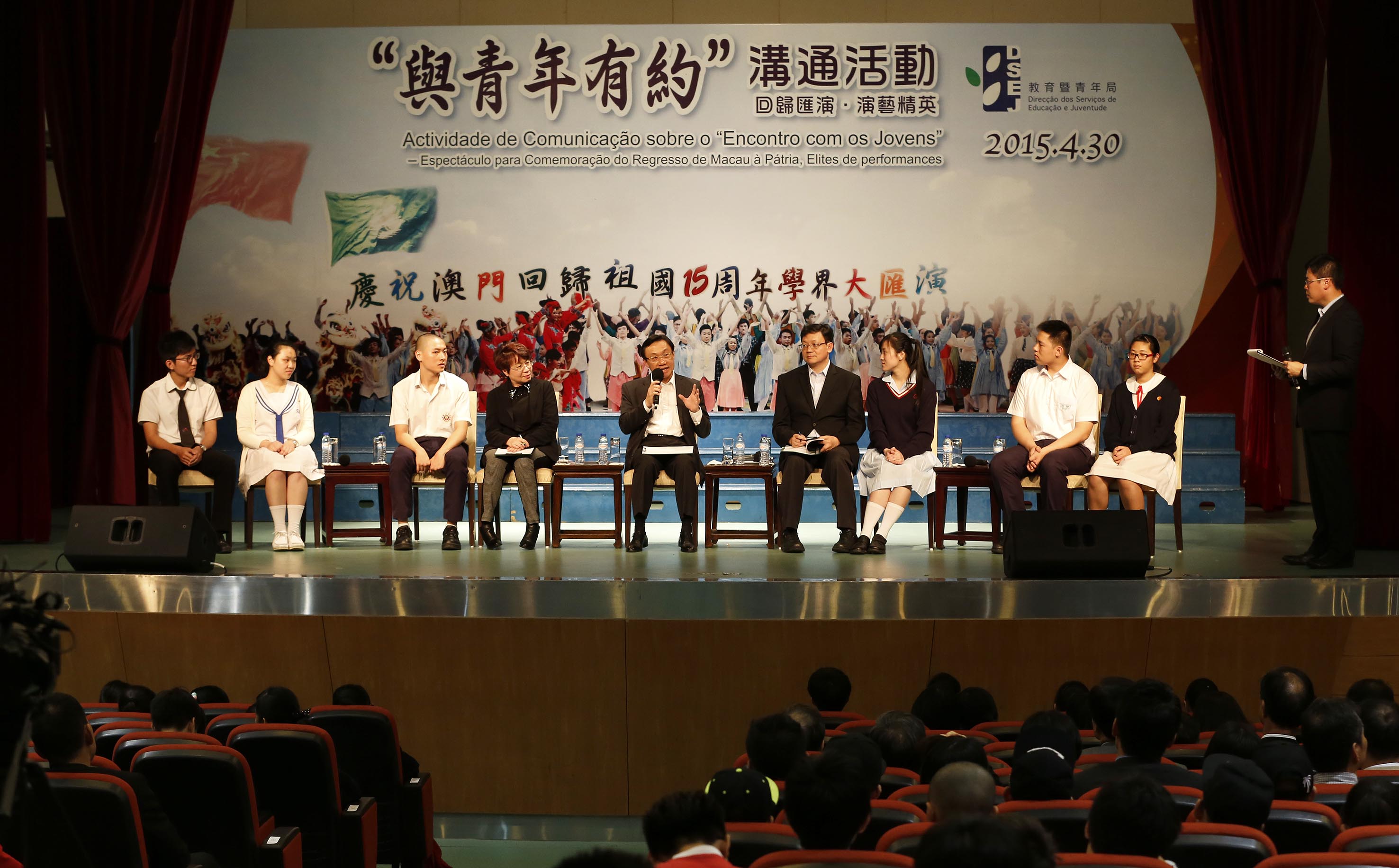為了積極落實“廣開溝通渠道、激發青年潛能”的施政方針,增加青年參與公共事務的渠道和機會,教育暨青年局定期舉辦活動與不同領域的青年進行交流。4月30日教青局假濠江中學何賢堂舉辦“與青年有約”溝通活動——回歸匯演‧演藝精英座談會。透過活動加強與演藝青年的溝通互動,了解該領域青年人的想法及意見。社會文化司司長譚俊榮、社會文化司司長辦公室主任黎英杰及教青局局長梁勵,以及多位非高等教育委員會委員、青年事務委員會委員與到場的300多名學生進行了互動交流。