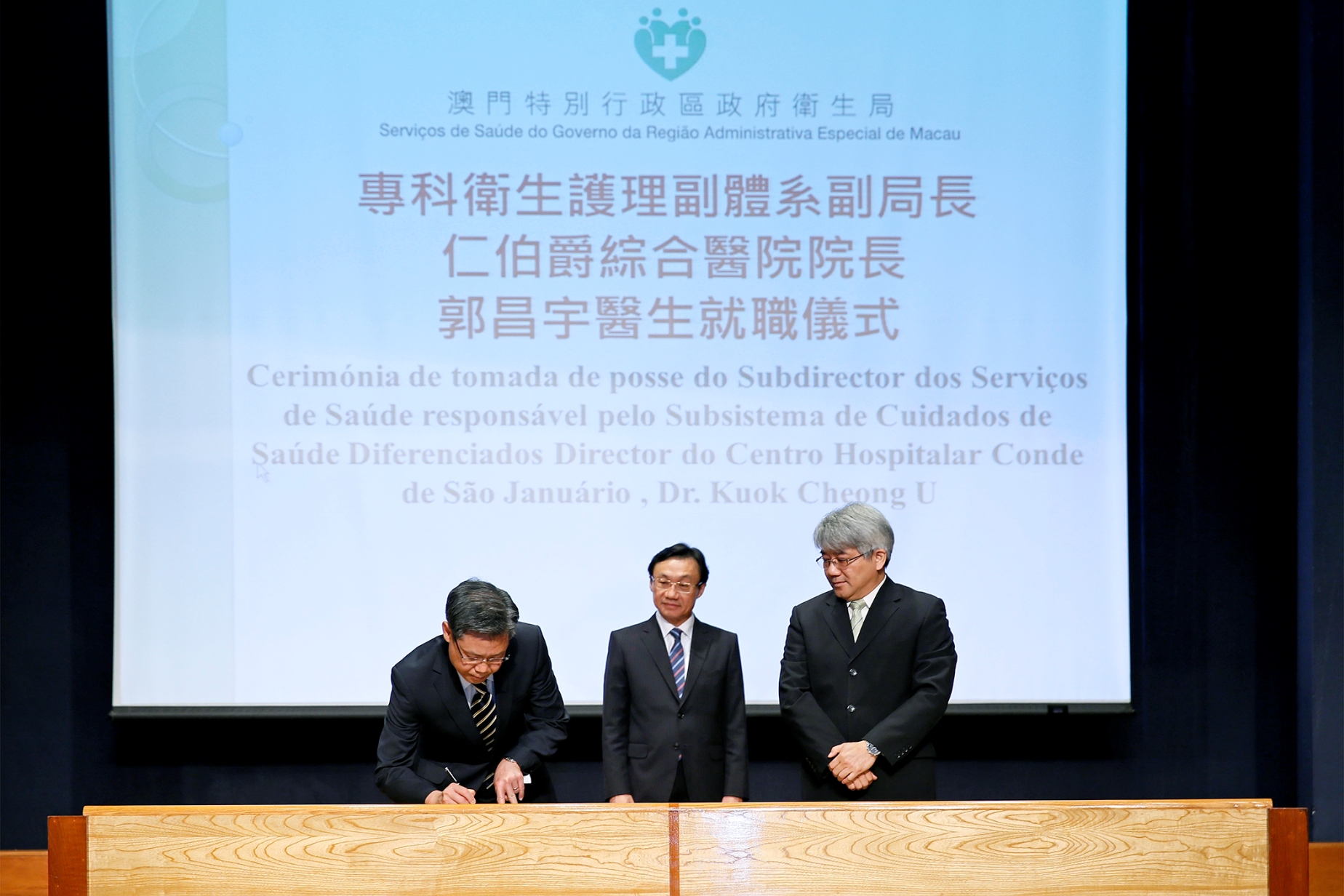 李展潤局長在致詞中感謝譚俊榮司長出席就職典禮,及特區政府長期以來對醫院各項工作給予的支持與肯定。他指出,隨著新一屆特區政府班子成立,各項醫療建設逐步落實,澳門醫療衛生事業迎來新挑戰亦面對著新的發展機遇。作為澳門唯一一所公立醫院,仁伯爵綜合醫院肩負著重要使命,致力完善各項醫療建設、提升醫療服務水平,更於2012 年取得澳洲醫療服務標準委員會(簡稱ACHS)醫院認證,取得的成績獲國際認同。他深信郭昌宇醫生就任衛生局副局長、仁伯爵綜合醫院院長後,將積極發揮所長,進一步提高仁伯爵綜合醫院的整體服務水平,深化醫院管理的制度改革。