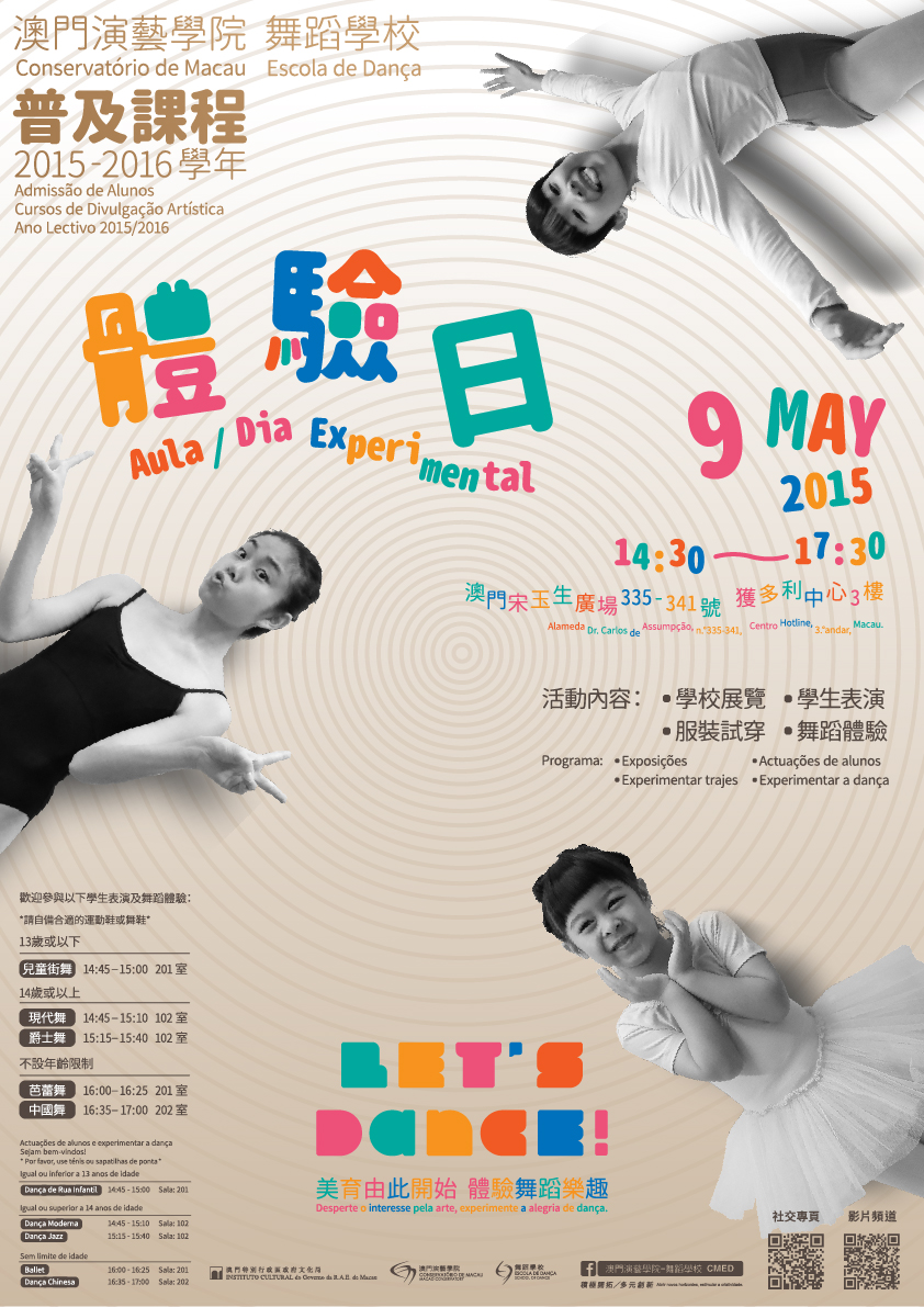 文化局澳門演藝學院舞蹈學校將於本周六(五月九日)下午二時三十分至六時舉行體驗日,開放校園以增進公眾對普及課程的瞭解,歡迎有興趣人士前往參與。