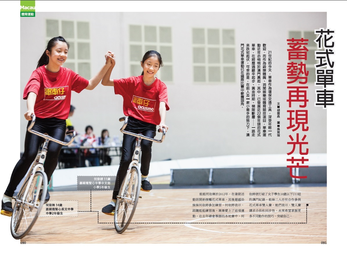 「花式單車 蓄勢再現光芒」:花式單車於澳門發展近22個年頭,經歷過艱辛起步、黃金時期、梯隊斷層……一路走來跌宕起伏。在前輩帶領及一眾小車手的努力下,澳門花式單車運動已在國際比賽中嶄露頭角。