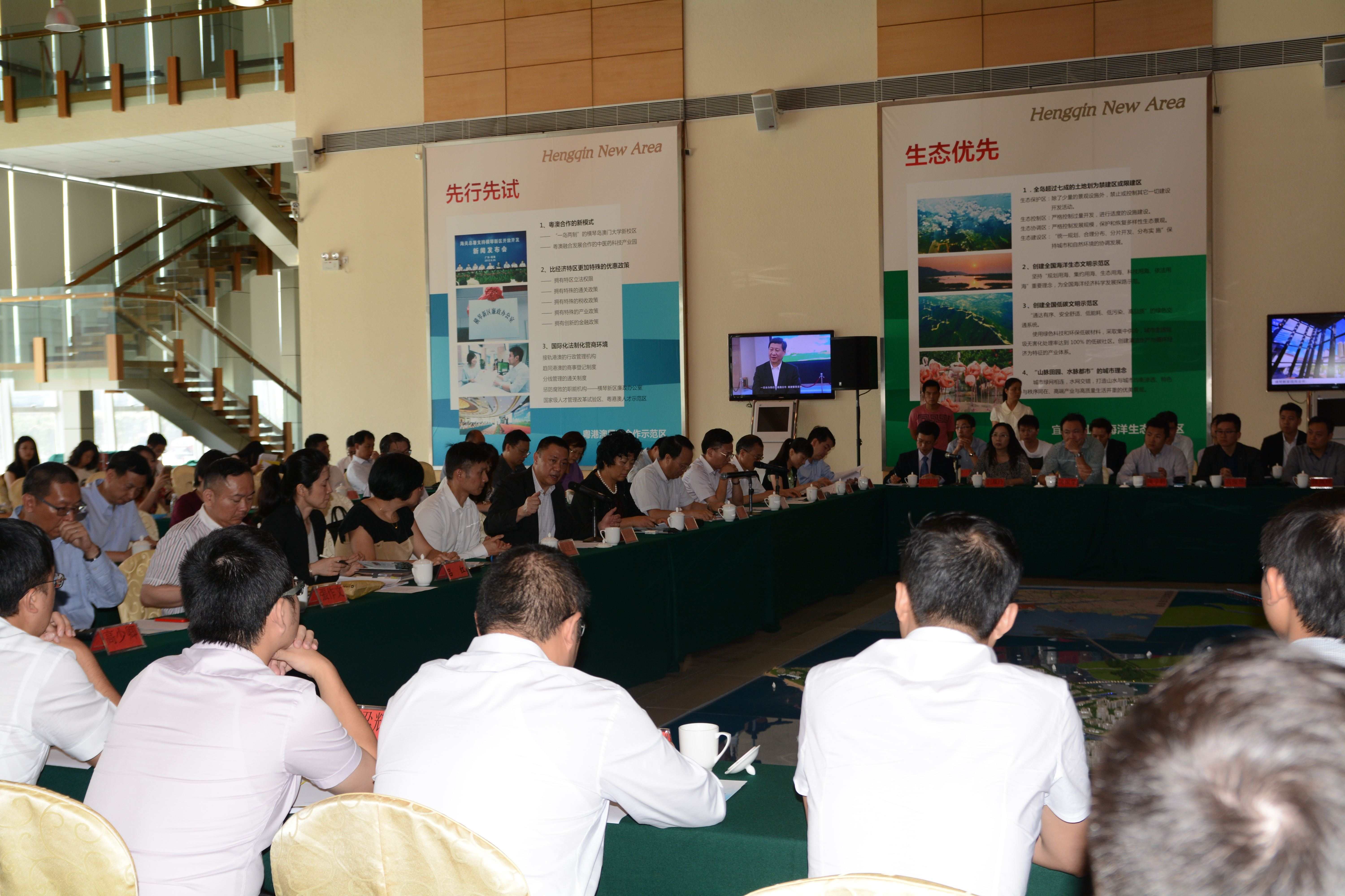 隨後,考察團與珠海巿委常委橫琴新區黨委書記劉佳等領導進行座談,多位青年企業家和青年團體代表在聽取橫琴近年發展的介紹後,分別就申請進入橫琴澳門青年創業谷的各項條件和優惠政策等提出意見及疑問,如免租使用辦公室年期能否延長、外國合作夥伴進出境簽證措施、入住創業谷內人才公寓的申請條件、在橫琴投資的企業及工作的澳門人可享受的稅務優惠、企業融資政策及配套措施、創業谷的服務配套和巿場推廣策略等。珠海橫琴新區管理委員會主任牛敬逐一回答了與會者的提問。