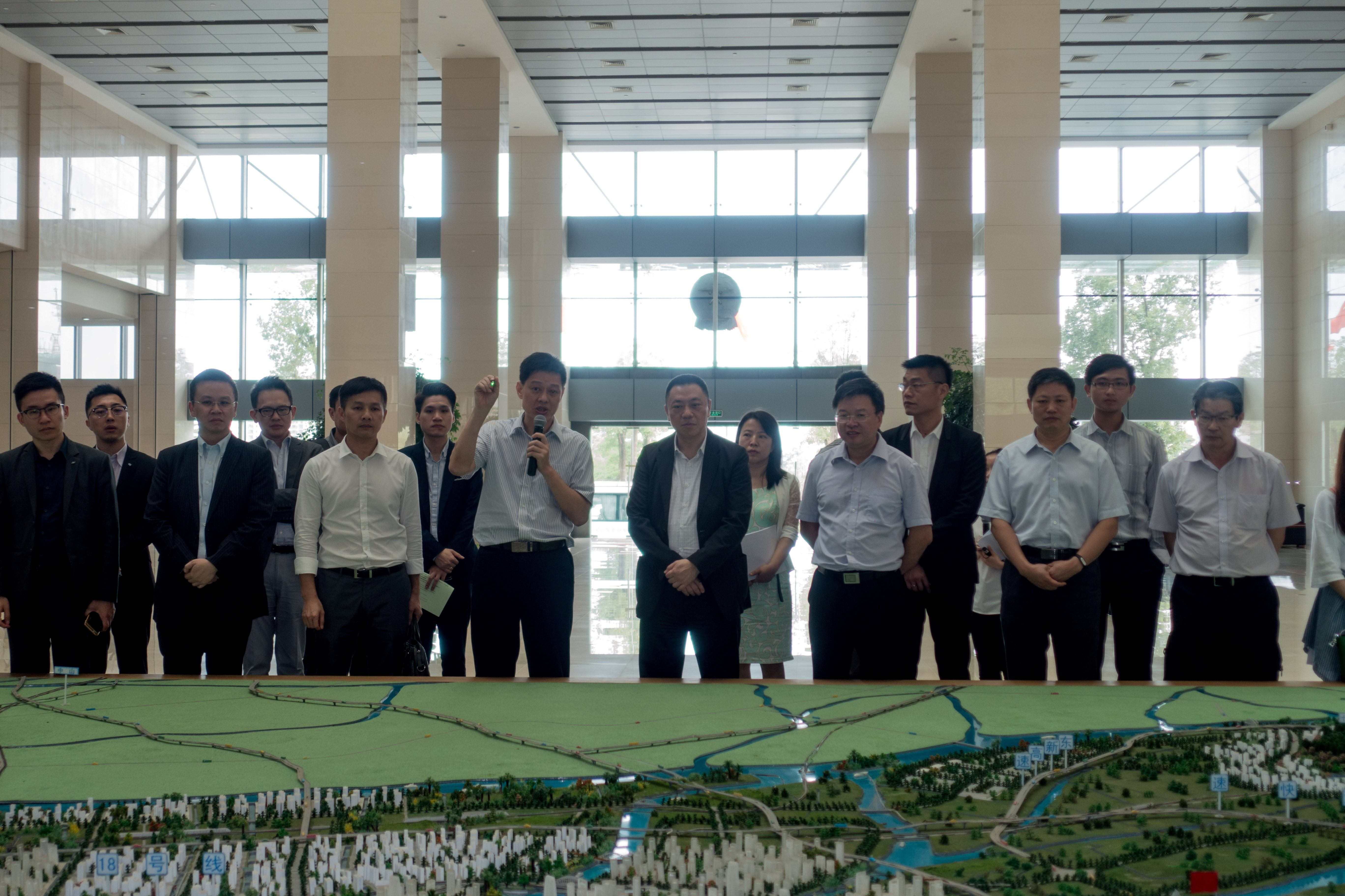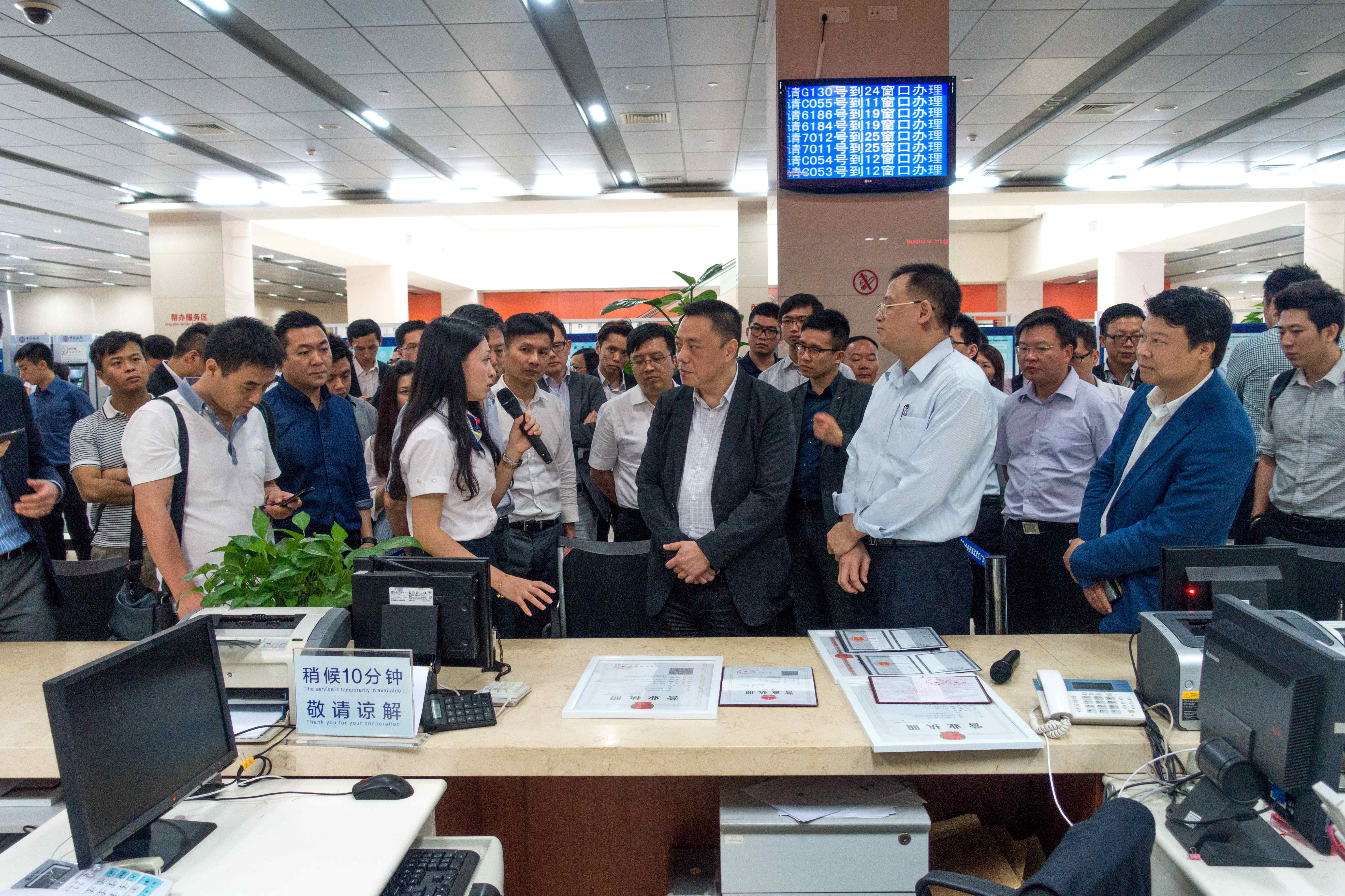 考察團一行還參觀了南沙區政務中心辦事大廳,了解南沙片區最新實施的三項行政審批改革措施,其一是工商登記“一口受理”運作模式,為新開設企業減少辦理手續程序及縮短辦理時間;二是對外商投資實行准入前國民待遇加負面清單管理模式,由原來的審批制改為備案制;三是實行“三證合一”和“電子營業執照”。最後團員還聽取了南沙區自貿辦副主任周海介紹的南沙片區的區塊劃分及其產業功能定位。