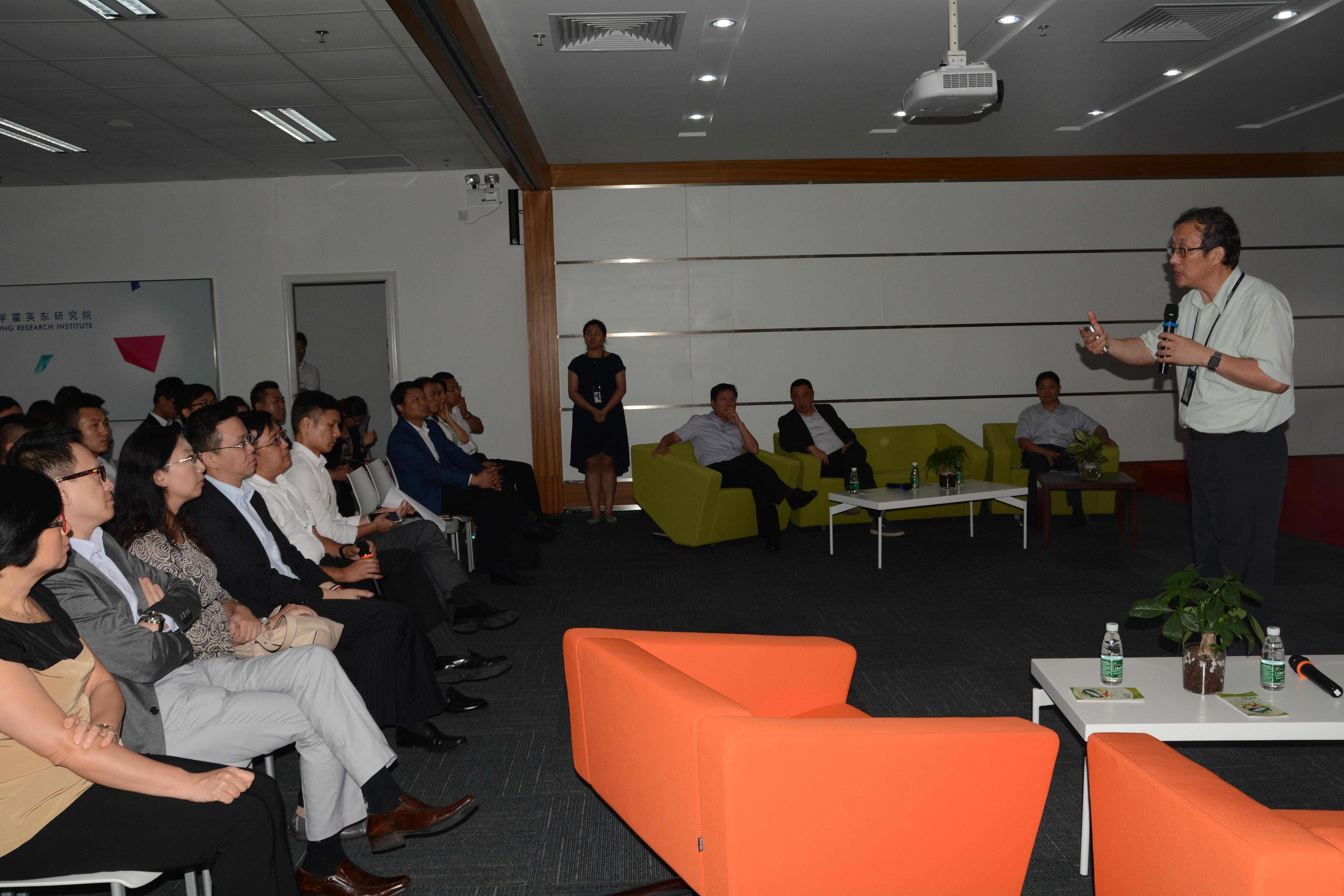 考察團一行其後到達南沙,在香港科技大學霍英東研究院署理院長吳景琛的介紹下,了解該院的智能監控技術、高效能源、建築環境和環境監控等科研技術,以及 “紅鳥創業苗圃” 計劃,該計劃為產業界和科研人員的對接提供平台,以推動科研成果產業化。此外,吳院長還介紹,設於該校的南沙粵港澳(國際)青年創新工場,可為粵港澳青年提供創新發明的場地。該院還可為青年創業者由研發到產業化全程提供顧問支援服務。