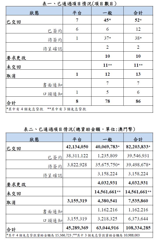 梁慶庭主席回顧基金工作時表示,基金去年共接收到500多個預約,成功交齊文件的有效申請321份,經評審後合符資格的項目共86個,現時基金正與企業進行協商並陸續簽訂正式協議書(見表一、表二)。為保證公帑的合理有效運用,基金要求受惠企業須依照已提交資料所述之規模執行項目,有部分企業認為資助金額與預期有較大出入,未能籌到足夠資金執行項目而考慮放棄接受資助,其中包括資助金額超過100萬的項目,亦有企業由於自身原因考慮放棄開展項目。因此,在剔除13個基於上述原因可能放棄的項目後,預計將有73個項目接受基金資助,包括7個平台項目及66個一般文產商業項目。