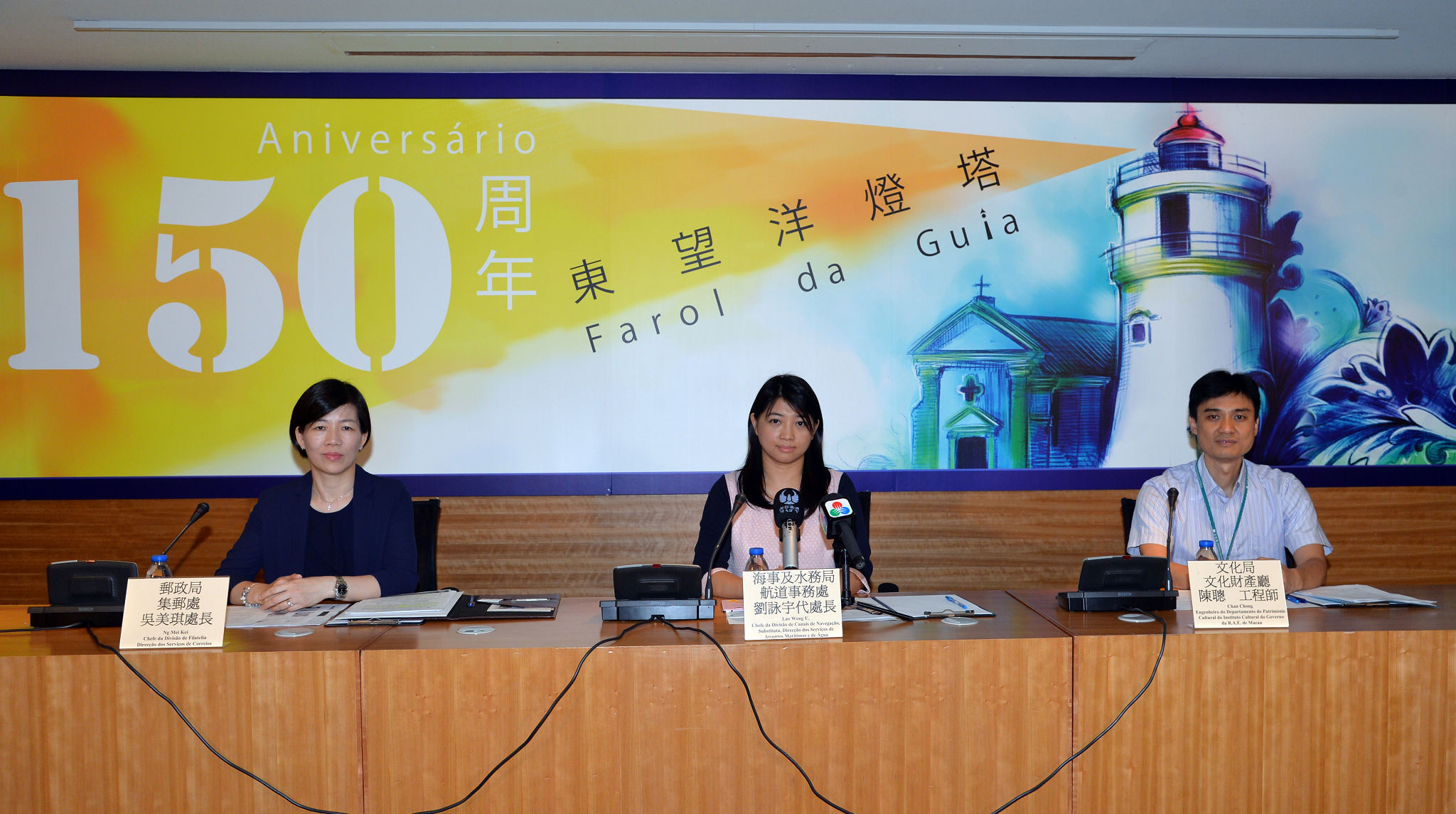 東望洋燈塔一百五十周年新聞發佈會於六月二十九日在塔石廣場文化局地庫演講廳舉行,海事及水務局代表航道事務處代處長劉詠宇、郵政局代表集郵處處長吳美琪及文化局代表文化財產廳土木工程師陳聰出席。