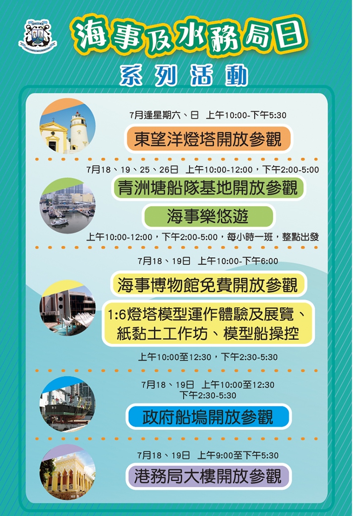 為慶祝7月18日“海事及水務局日”以及與眾同樂,海事及水務局將於7月舉行“海事及水務局日”系列活動,屆時海事及水務局轄下設施和單位包括港務局大樓、政府船塢、東望洋燈塔、海事博物館及船隊基地青洲塘免費對外開放(時間詳見日程表),並會舉辦海事設備展覽、模型展覽、趣味工作坊、攤位遊戲、“海事樂悠遊”以及“上山下海蓋印攞滿分”等精彩活動。活動豐富有趣,老少咸宜,適合親子同樂,充實海事見聞,歡迎市民踴躍參與,豐富盛夏餘暇。活動詳情請瀏覽海事及水務局網頁http://www.marine.gov.mo。
