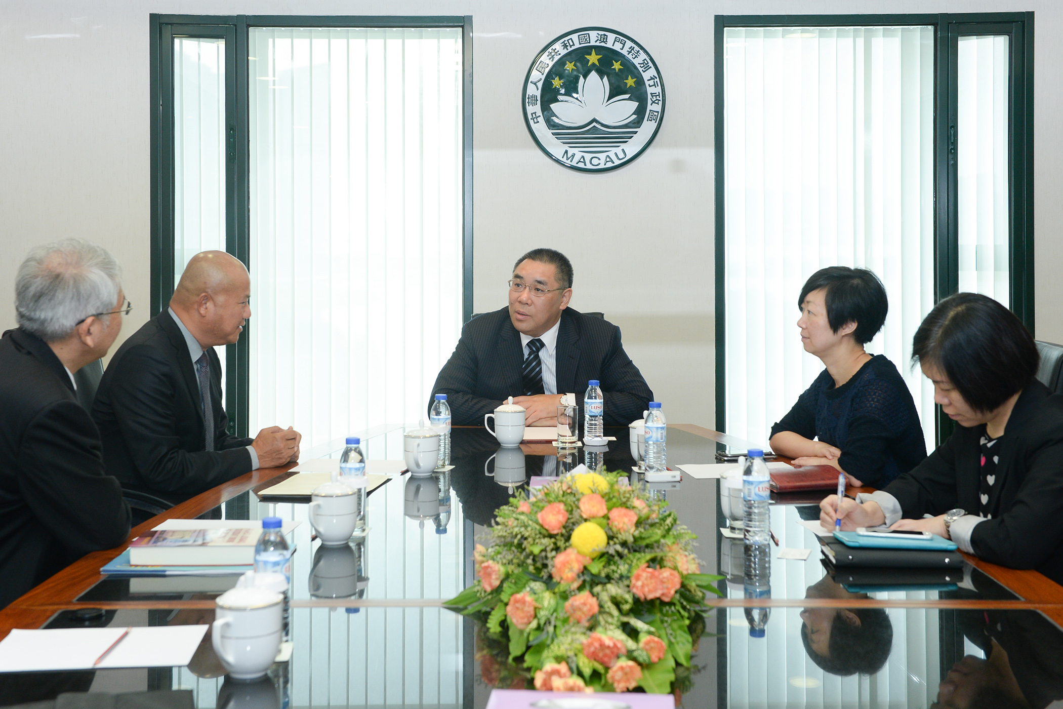 行政長官崔世安今(6)日在政府總部會見澳門城市大學校董會主席陳明金及新任校長張曙光教授,就高等教育下一階段的發展和培養人才交換意見。