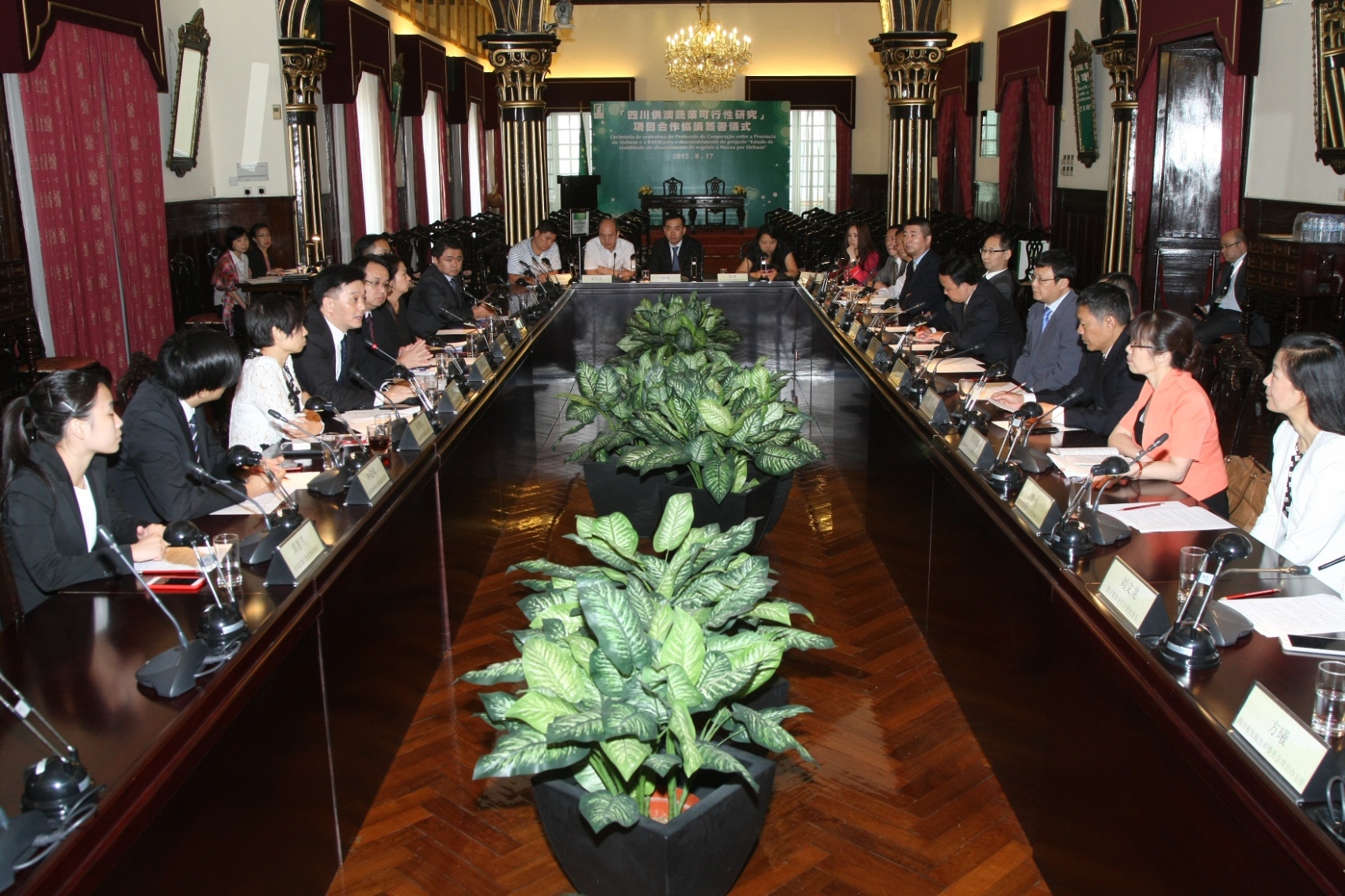 《「四川供澳蔬菜可行性研究」項目合作協議》簽署儀式於民署大樓禮堂舉行,由民政總署管理委員會主席黃有力與四川省農業廳廳長任永昌,分別代表本澳和四川簽署有關合作協議,象徵本澳和四川將以蔬菜供銷合作為重點,在推進兩地政府在泛珠三角區域合作的基礎上,加強包括農業的交流合作及落實工作設想方面,取得實質性的進展。