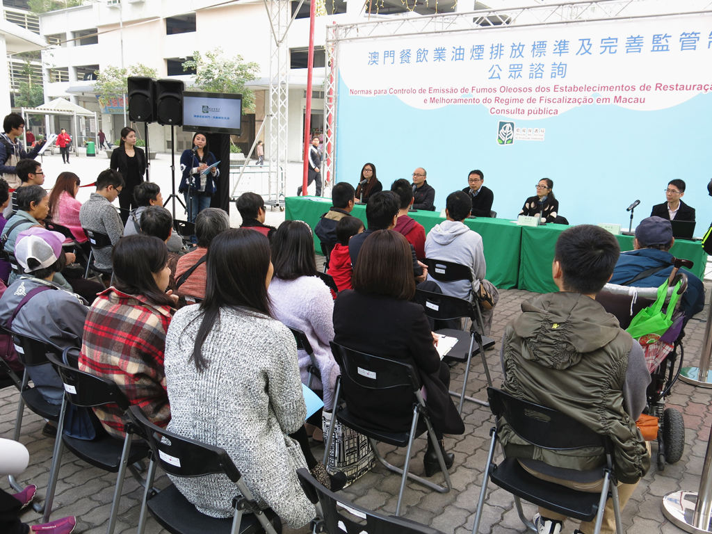 特區政府近年將改善空氣質素列為重點環保施政工作之一,制定了《澳門餐飲業油煙排放標準及完善監管制度》諮詢文本,對現行油煙排放標準及監管制度提出進一步的優化方案,提出關於澳門餐飲業場所的油煙排放標準、油煙處理設備管理規範和監管制度之建議方案,以及相關建議的配套政策和措施等,其中亦建議油煙排放標準為每立方米1.5毫克(1.5mg/m3),並於去年12月17日至今年年3月16日期間進行公開諮詢,期間除透過不同渠道收集居民的意見外,亦分別舉辦了9場面向環境諮詢委員會、社區服務諮詢委員會、餐飲業場所及業界、相關政府部門、社會團體、大專院校、公眾等諮詢專場。