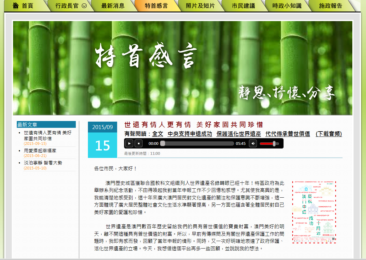 行政長官在原聲錄音中,回憶十年前在中央政府及多個部委的有力支持下,特區政府組織跨部門小組進行申報工作;在申報過程中,多次邀請國家文物局、國際古跡遺址理事會的代表,和國內、外其他有經驗和影響力的世界文化遺產專家和學者來澳門,在關鍵階段多次給予意見和有益的建議,到最後達成以包含相關聯的傳統歷史街巷和前地、統籌物質文化遺產與非物質文化遺產於一體的澳門歷史城區來作申報,使澳門歷史城區在2005年獲得聯合國教科文組織世界遺產委員會一致通過,被正式列入世界遺產名錄,成為中國第31處世界遺產。