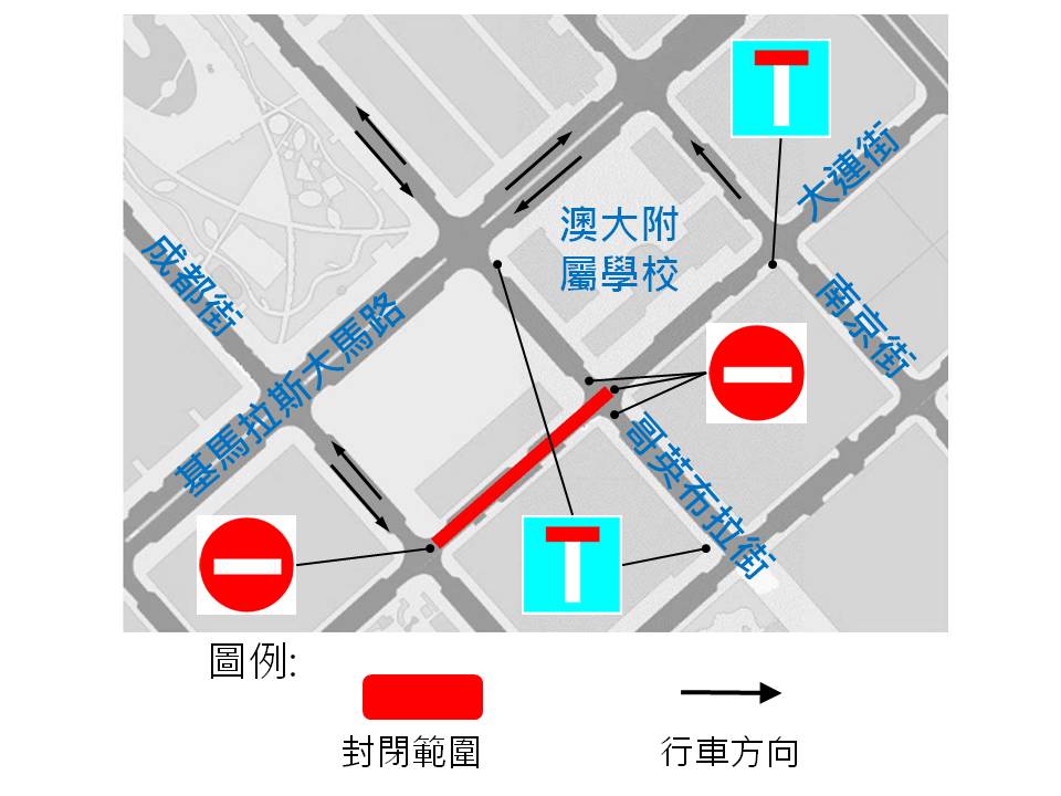 隨著工程推進,介乎成都街與哥英布拉街之間的一段大連街,本月19日(周六)實施封閉交通,介乎南京街與哥英布拉街之間的一段大連街、介乎大連街與基馬拉斯大馬路,以及埃武拉街之間的一段哥英布拉街改為無出口道路。與此同時,介乎基馬拉斯大馬路與大連街之間的一段南京街則改為單一方向行車,車輛只可由大連街往基馬拉斯大馬路方向行駛。